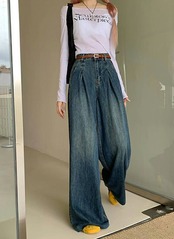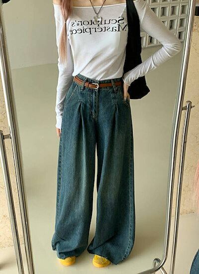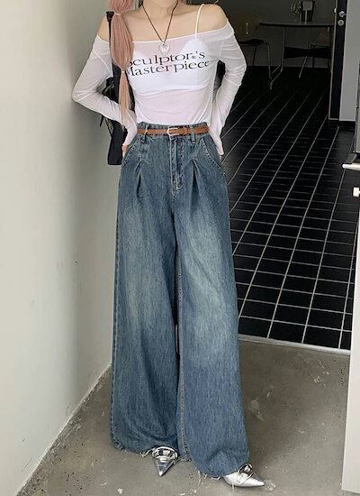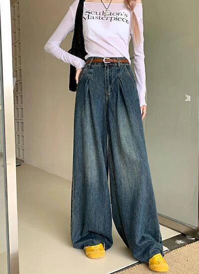 デニムパンツ ワイドパンツ レディース デニム パンツ ウエストゴム ロング丈 無地 リボン ガウチョパンツ タック ポケット付き ボトムス 体型カバー ゆったり ロングパンツ フレア カジュアル き