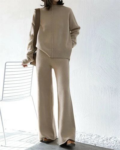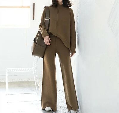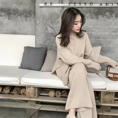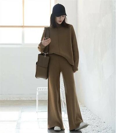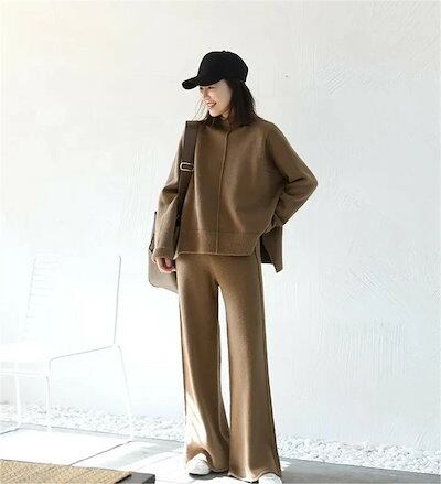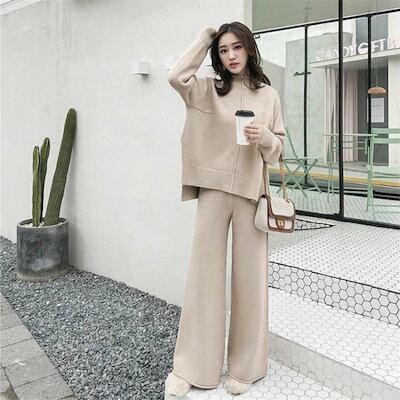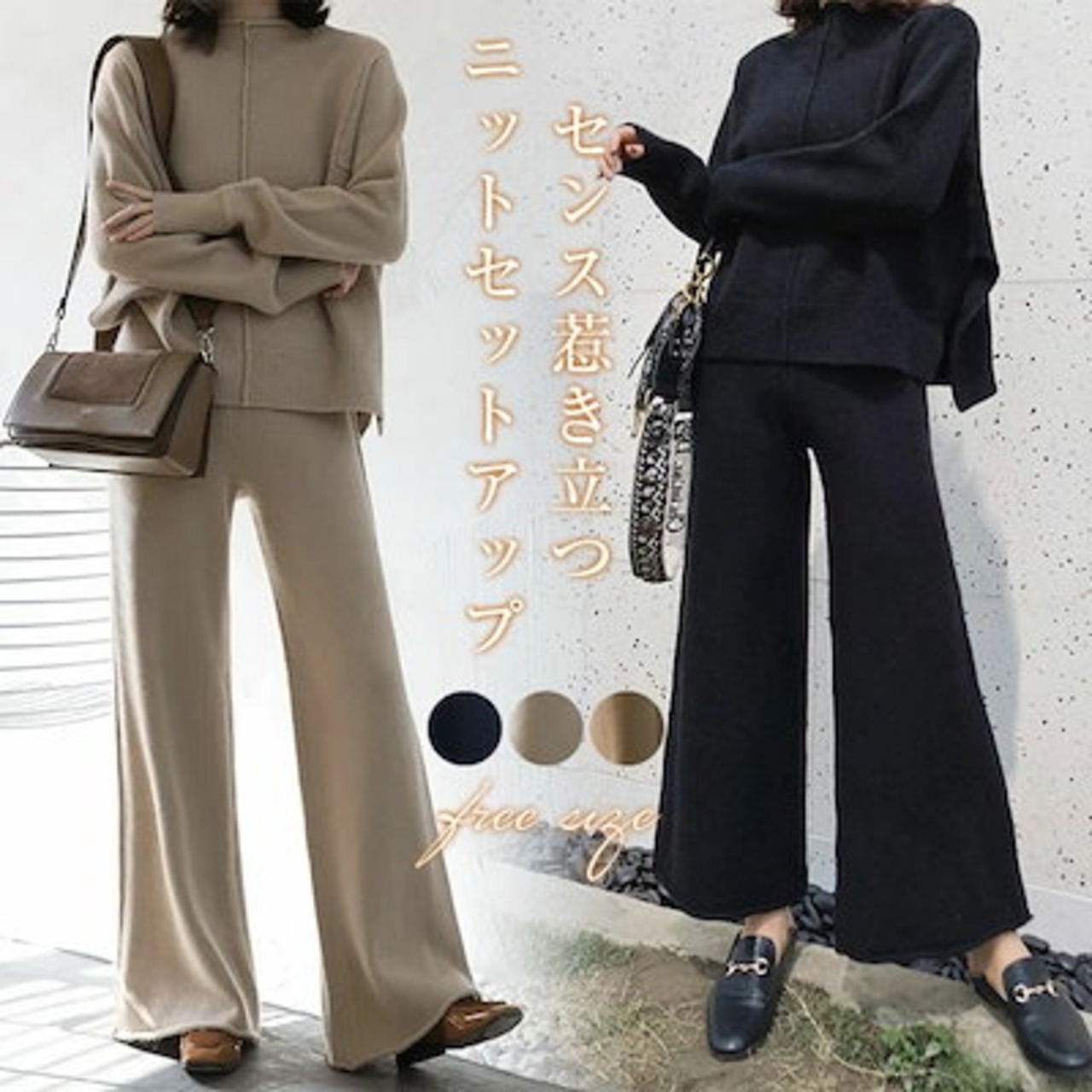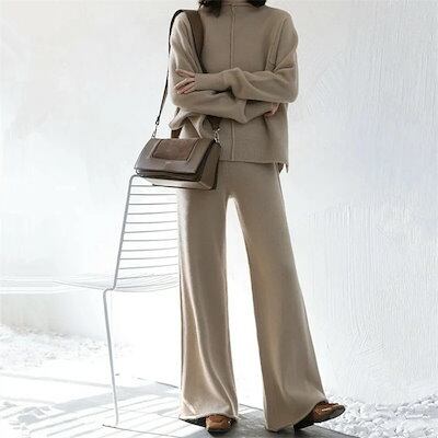 セットアップ ニット レディース 秋冬 ニットセット 2点セット 上下セット セーター&ワイドパンツ ハイネック プルオーバー 秋冬セット フレアパンツ サイドスリット ニットパンツ ロングパンツ カ