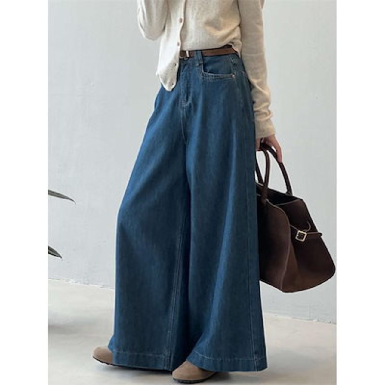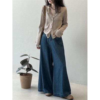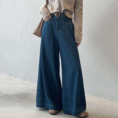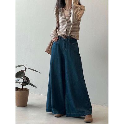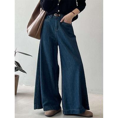 デニムパンツ パンツ レディース デニム 春 夏 秋 冬 無地 ワイドパンツ ジーンズ ロング 体型カバー ガウチョパンツ ボトムス フレアパンツ リラックスパンツ