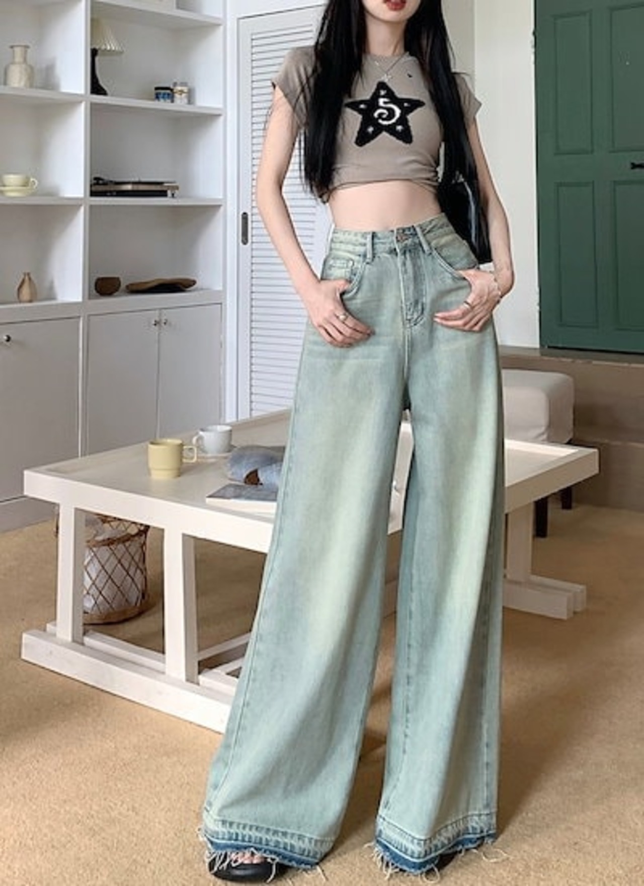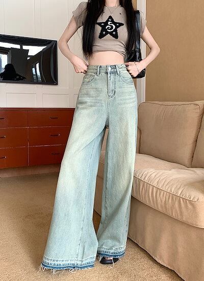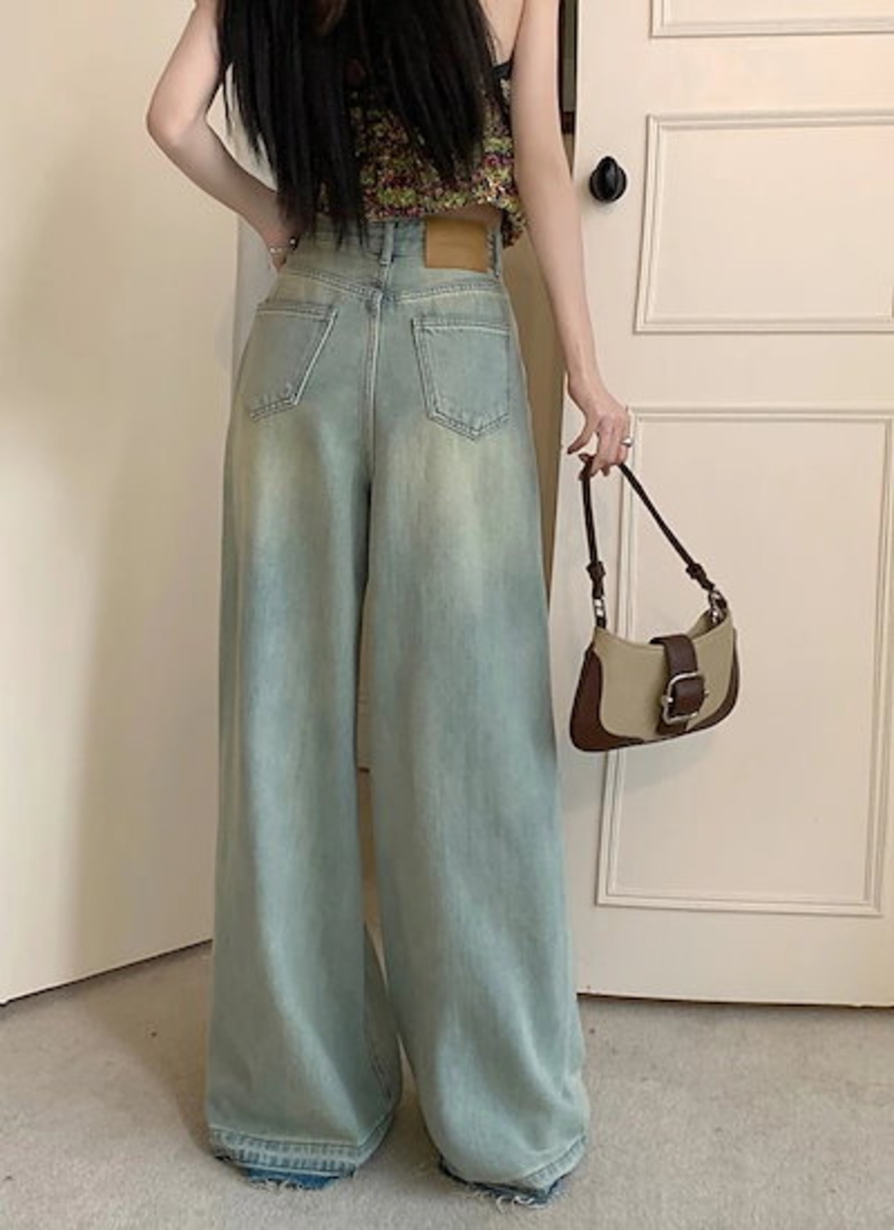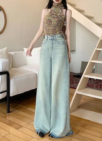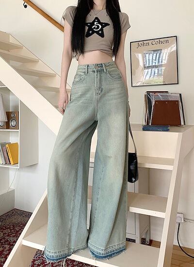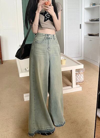 ボトムス レディース ハイウエスト ウォッシュ加工 ワイドデニム ジーンズ ワイドパンツ バギーパンツ スタイルアップ 脚長 美脚 カジュアル かっこいい クール 韓国
