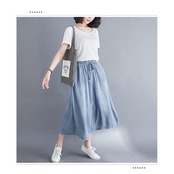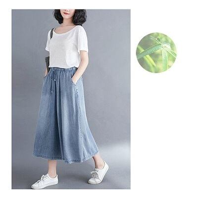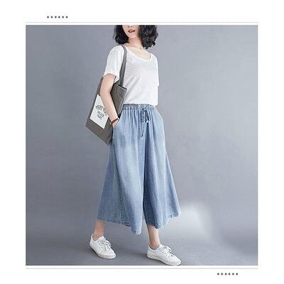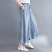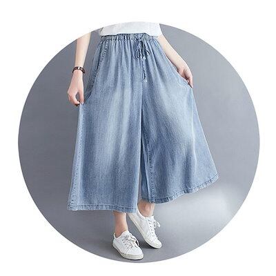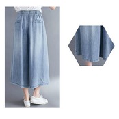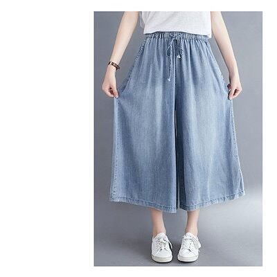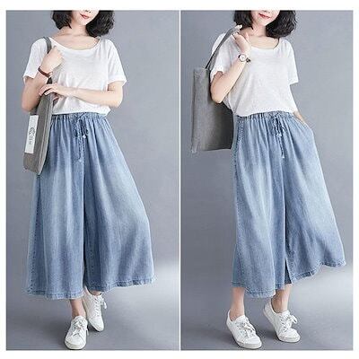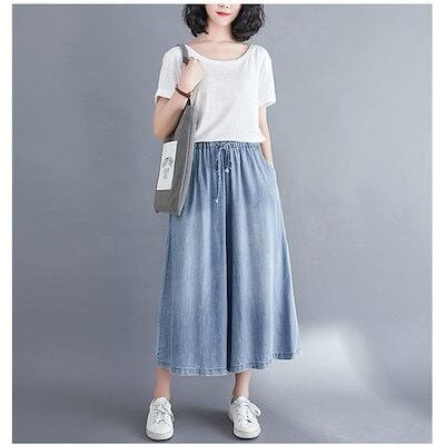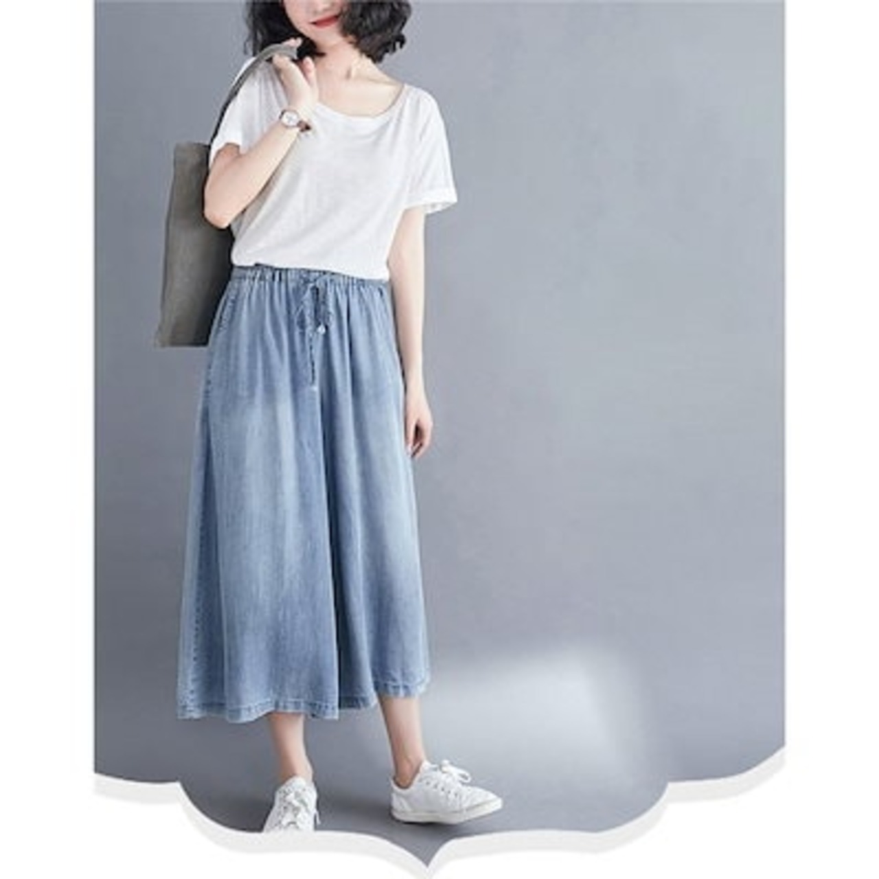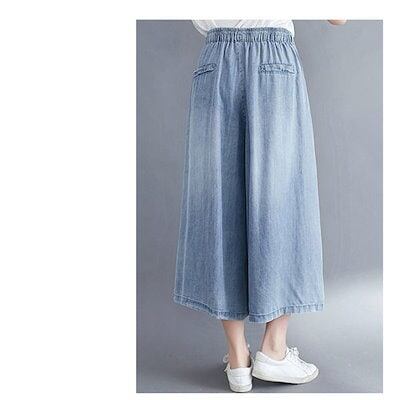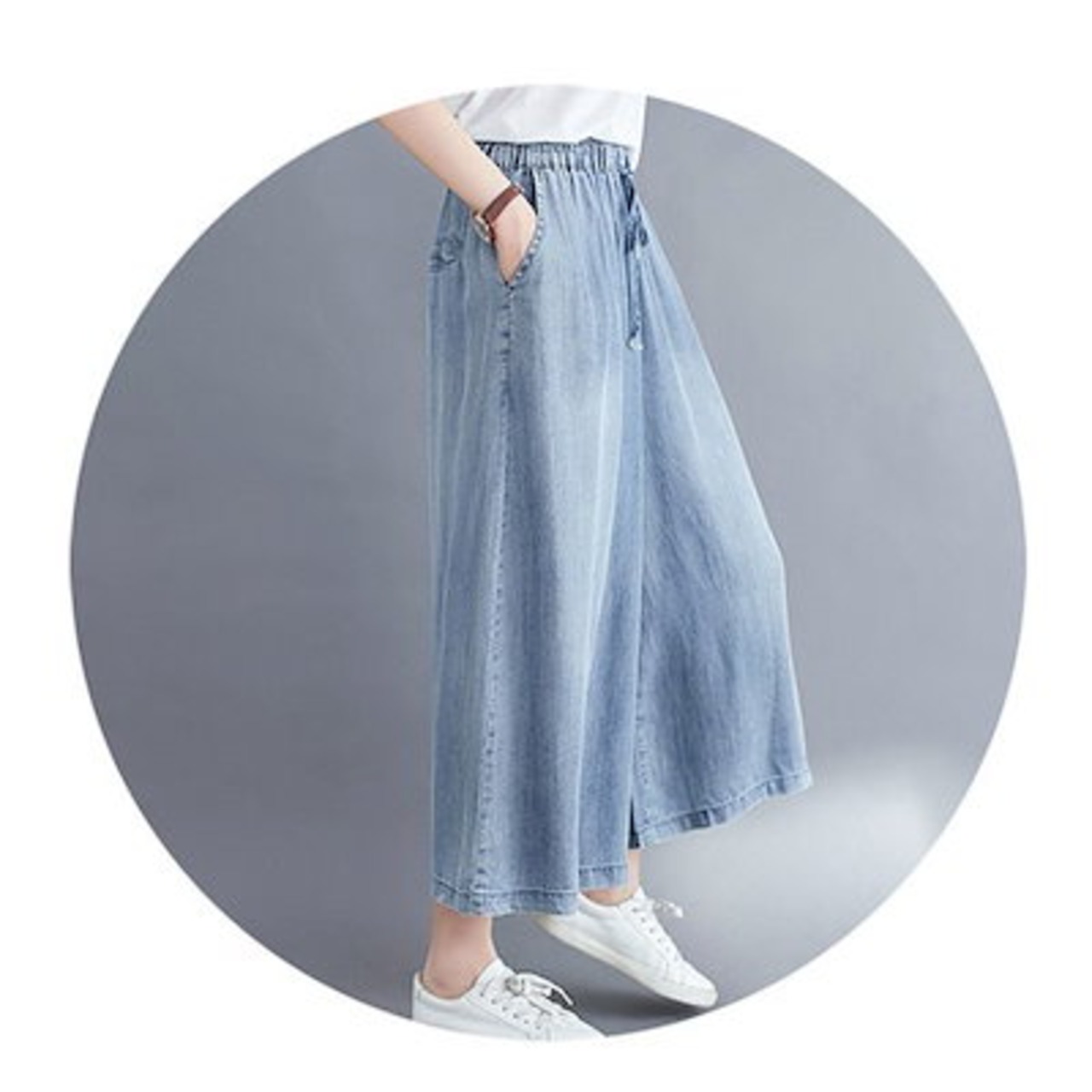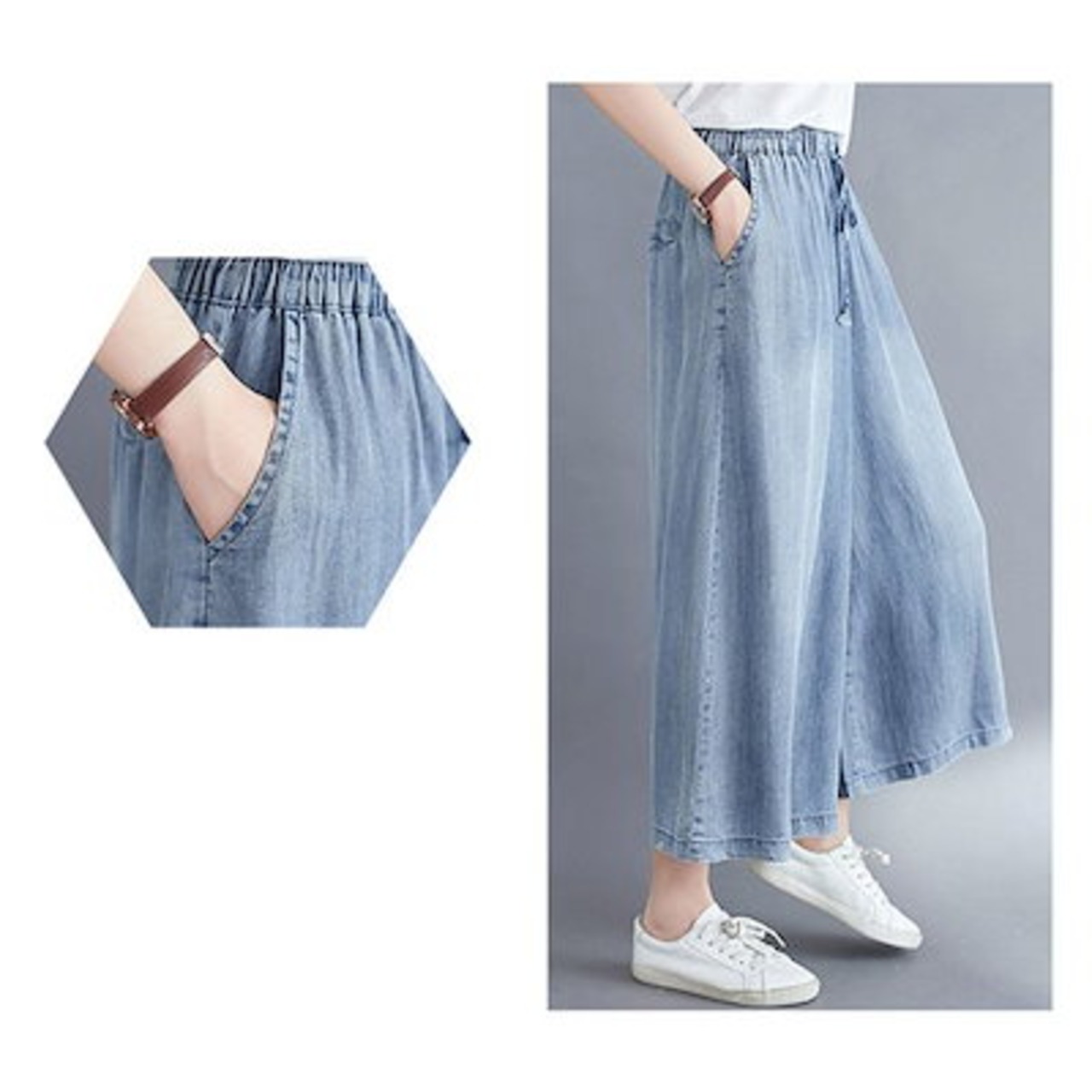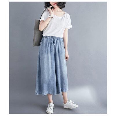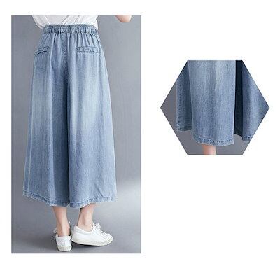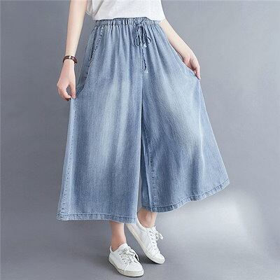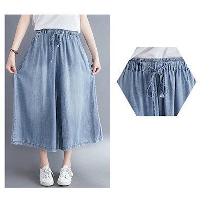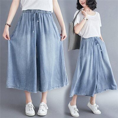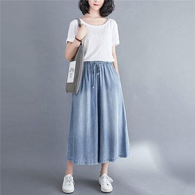 ワイドパンツ デニム レディース ガウチョパンツ 8分丈 バギーパンツ ジーパン 薄手 ウエストゴム 春夏 ズボン 大きいサイズ ゆったり おしゃれ
