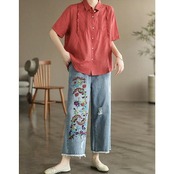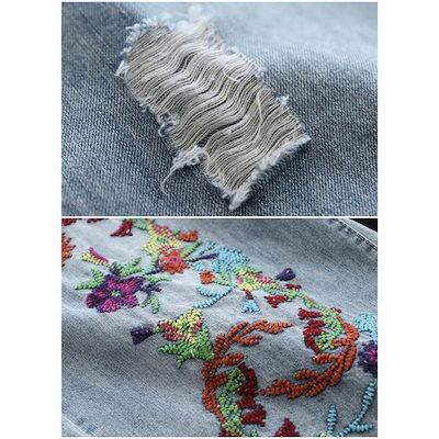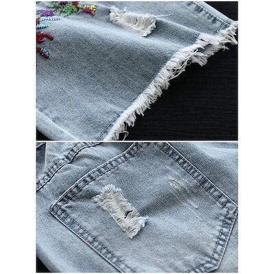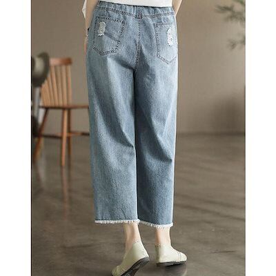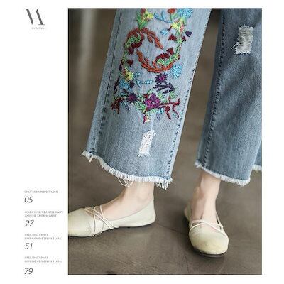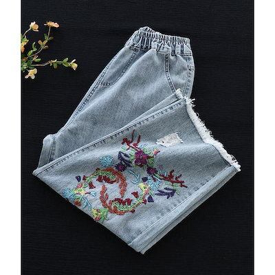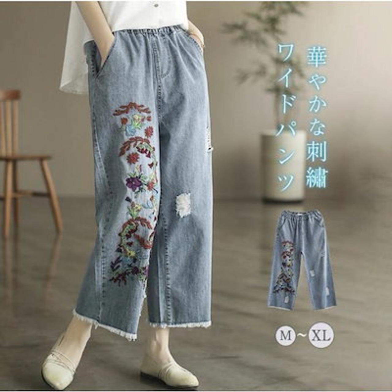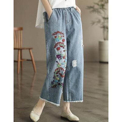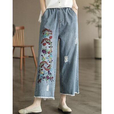 デニムパンツ ストレートパンツ レディース 夏 9分丈 ゆったり ワイドパンツ 刺 デニム 柔らか バギー ボトムス チノパン 大きいサイズ 春 カジュアル