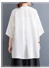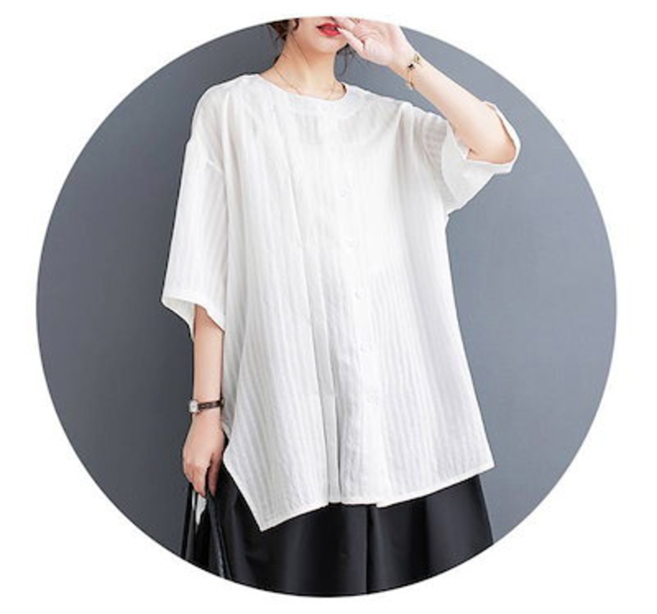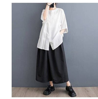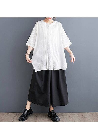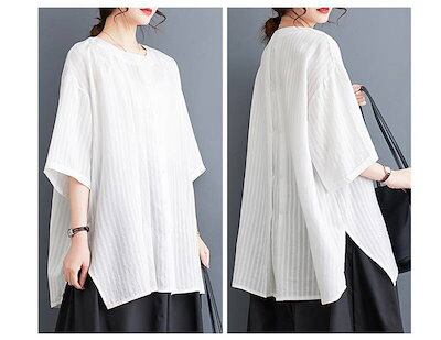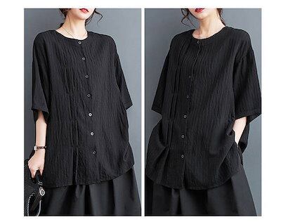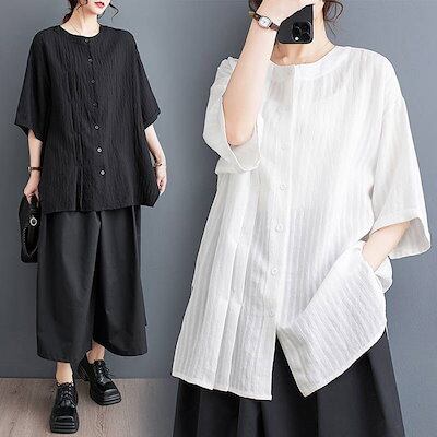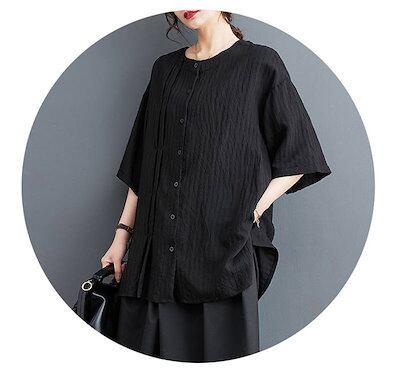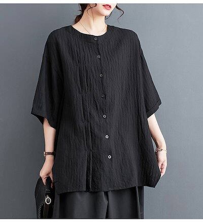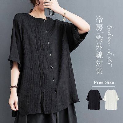 シャツ ブラウス レディース 夏 カーディガン 五分袖 クルーネック カットソー トップス 切り替え 薄手 前開き 無地 カーデ 綿麻風 羽織り 大人 着痩せ 体型カバー ふんわり エレガント カジュ
