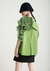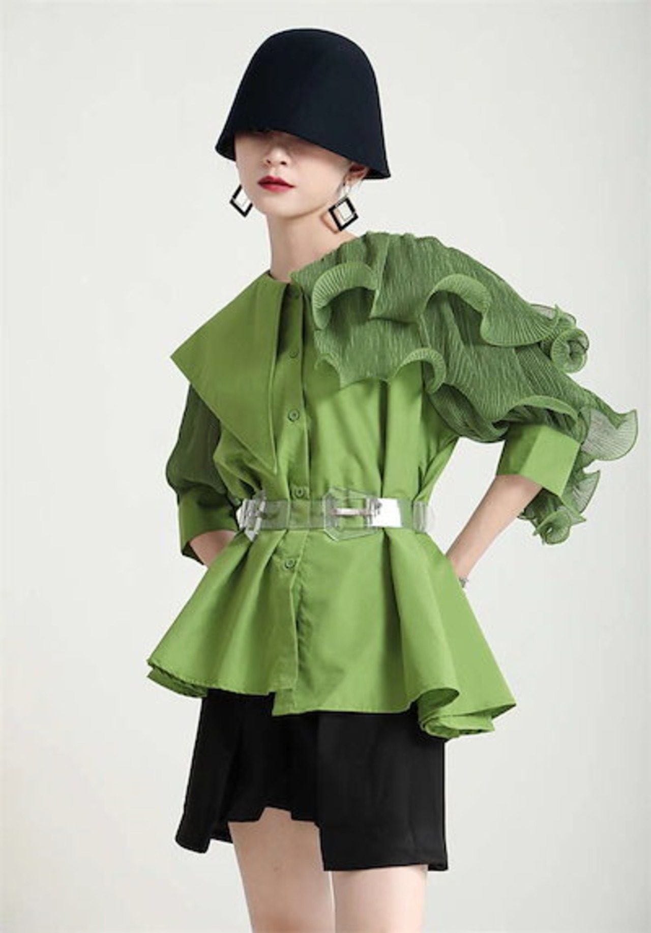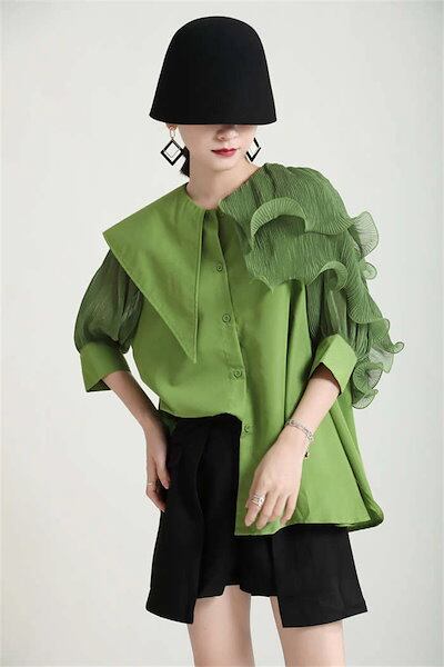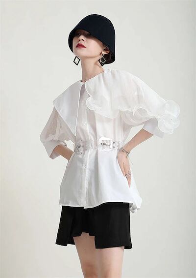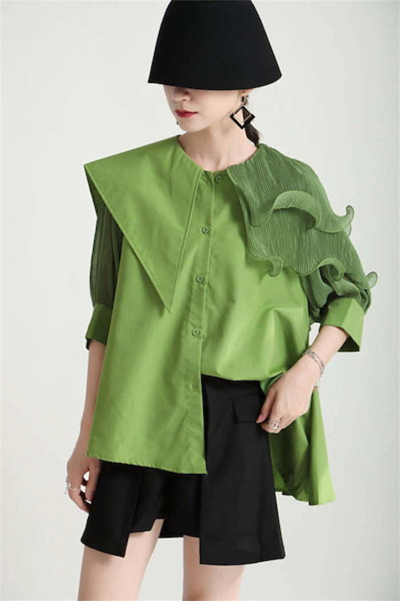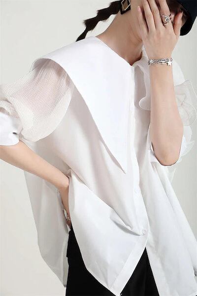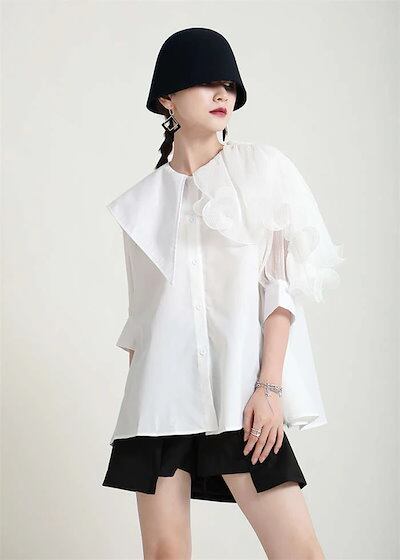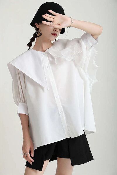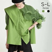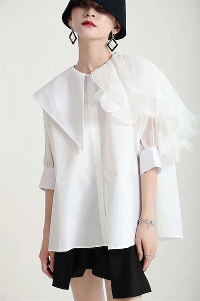 アシンメトリーフリルカラー ブラウス レディース 五分袖 トップス ブラウス フリル ケープカラー ビッグカラー アシンメトリー 個性的ブラウス 変形デザイン モード系 仕事 可愛い 無地 夏 夏物