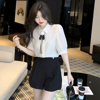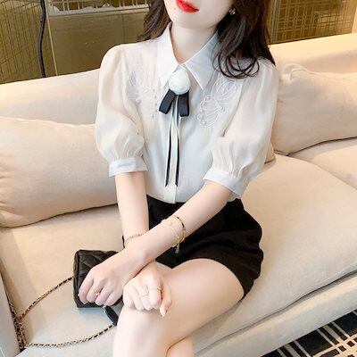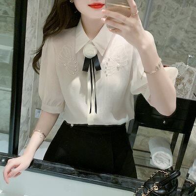 今っぽシアーシャツ使える!シフォンブラウス今っぽシアーシャツサテンシャツ蝶結び折襟職業通勤ブラウス半袖レディース夏服韓国ファッションシフォン