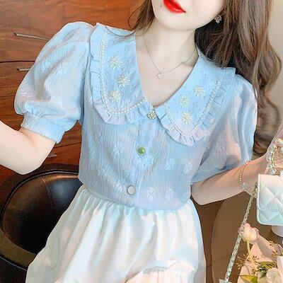 今っぽシアーシャツ使える!シフォンブラウス今っぽシアーシャツ可愛い半袖トップスレディース夏服サテンシャツ韓国ファッションブラウスシフォンシャツ刺繍パール