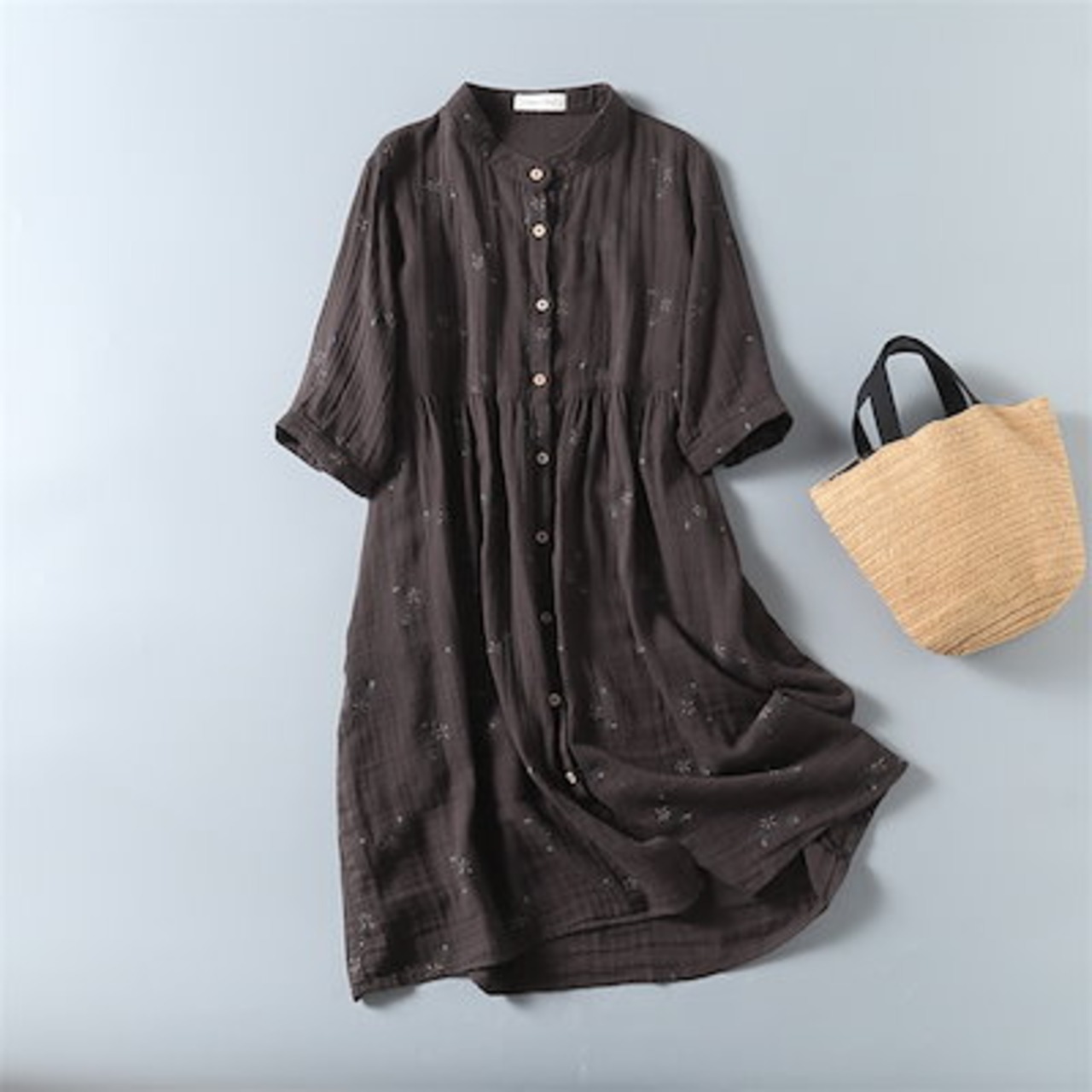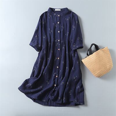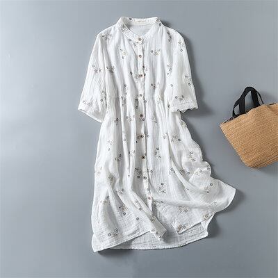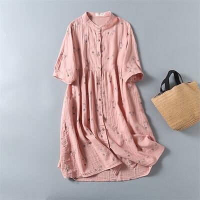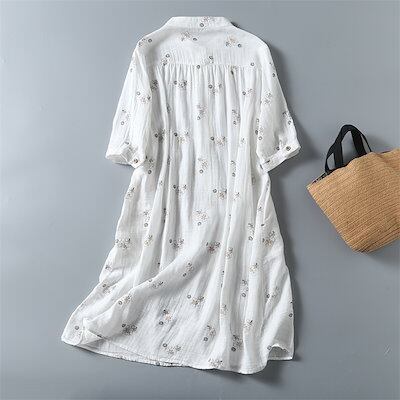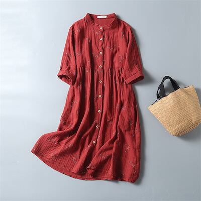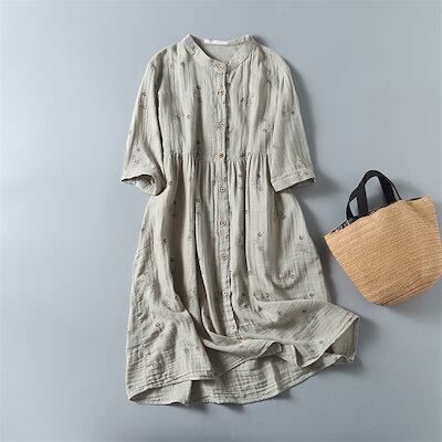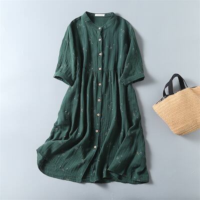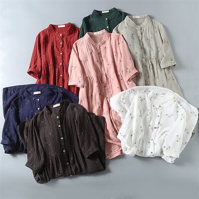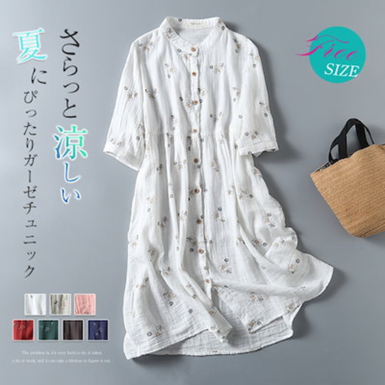 ガーゼワンピース チュニック レディース 夏トップス 半袖 大きいサイズ シャツワンピース 膝丈ワンピース 夏 花柄ワンピース 総柄 かわいい 立ち襟 ゆったり 体型カバー ガーゼ綿 着痩せ シンプル