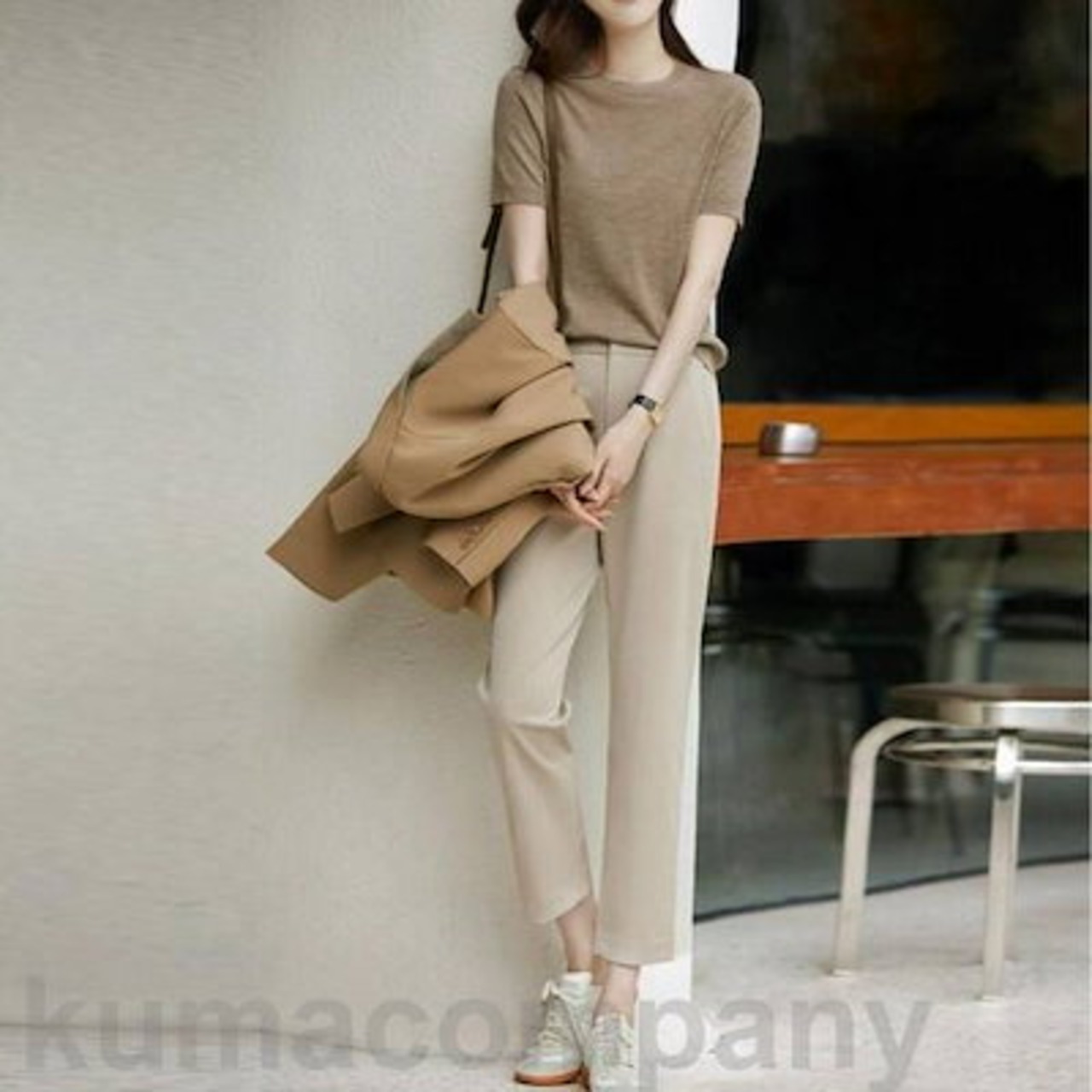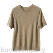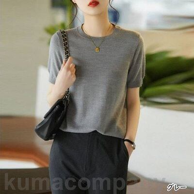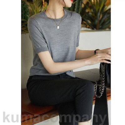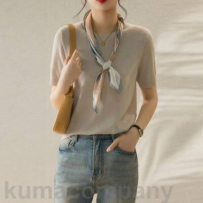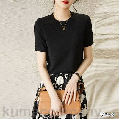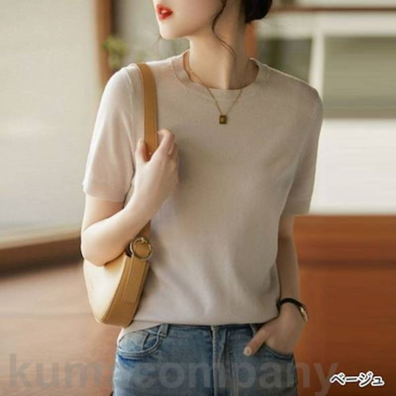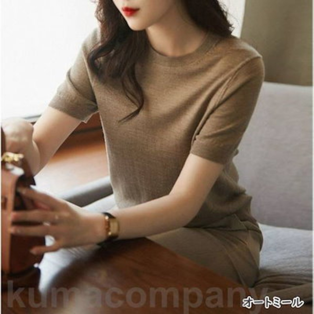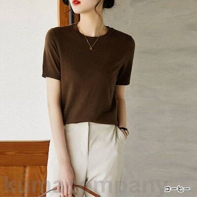 トップス ニット カットソー クルーネック エレガント レディース きれいめ カジュアル おしゃれ 半袖 大人 可愛い フェミニン シンプル ナチュラル 薄手 ベーシック ブラウン ベージュ