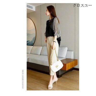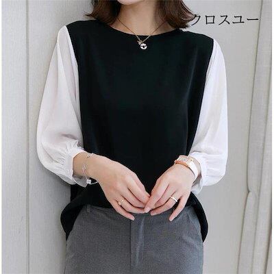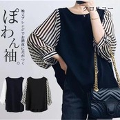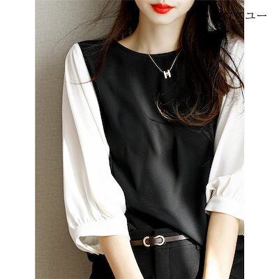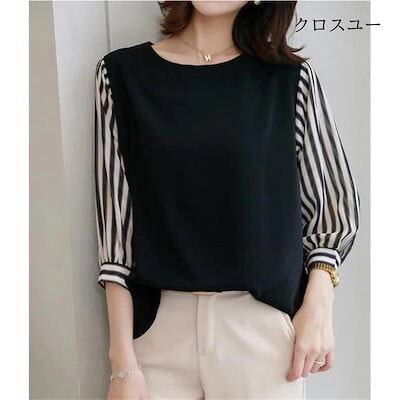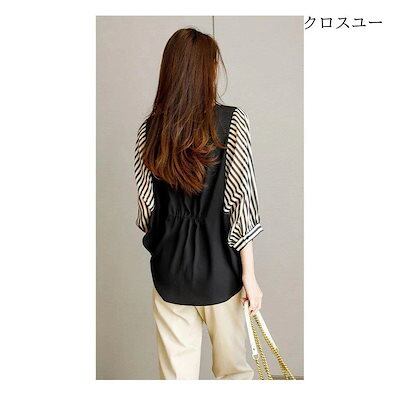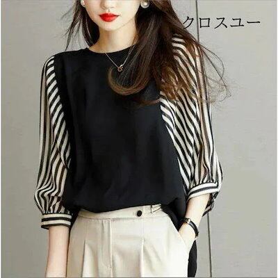 ブラウスレディース40秋冬作オシャレブラウスシフォンシャツ五分袖トップスカジュアルボーダー切り替えパフスリーブゆったり大