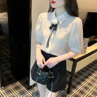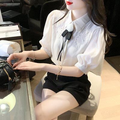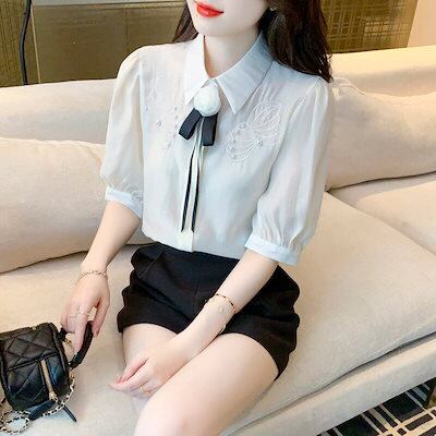 使える!シフォンブラウス今っぽシアーシャツサテンシャツ蝶結び折襟職業通勤ブラウス半袖レディース夏服韓国ファッションシフォン
