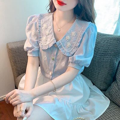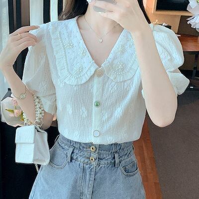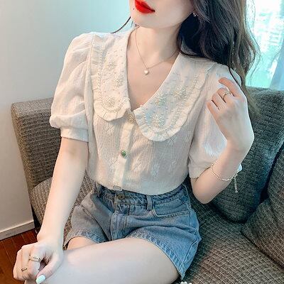 使える!シフォンブラウス今っぽシアーシャツ可愛い半袖トップスレディース夏服サテンシャツ韓国ファッションブラウスシフォンシャツ刺繍パール