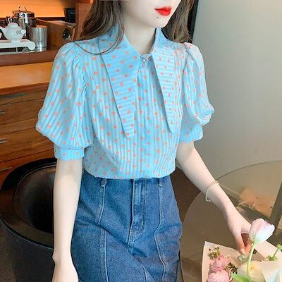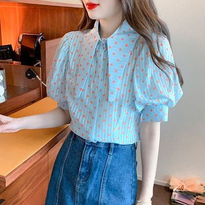 使える!シフォンブラウス今っぽシアーシャツ可愛い韓国ファッションレディース半袖夏服トップスドット折襟若見え大人気