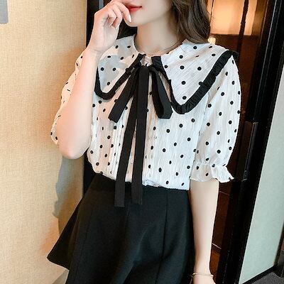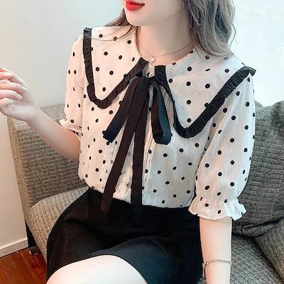 使える!シフォンブラウス今っぽシアーシャツ可愛いドットサテンシャツブラウス半袖夏服レディースシフォンシャツ韓国ファッショントップス
