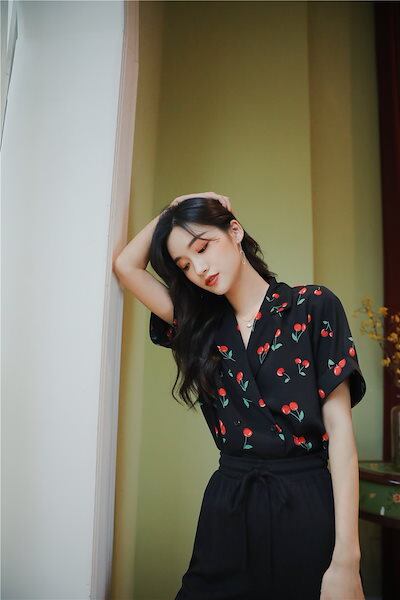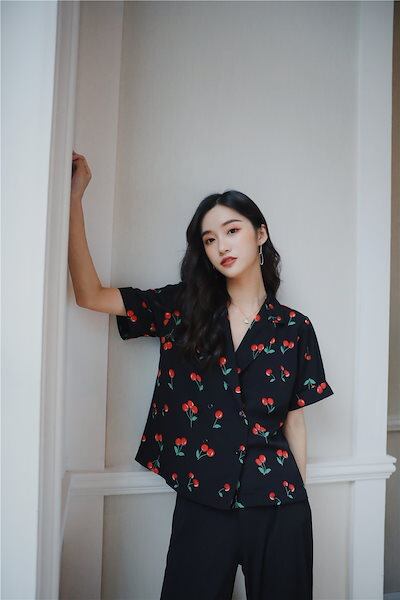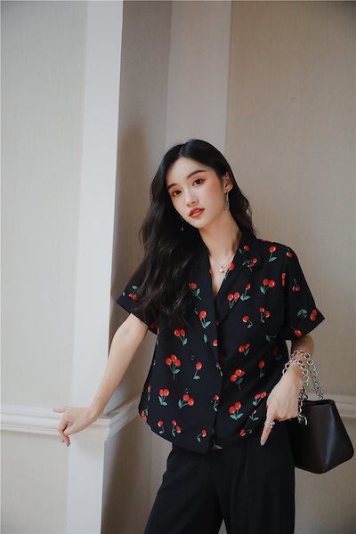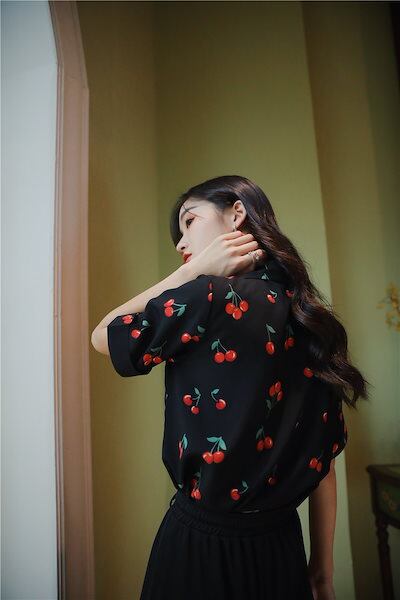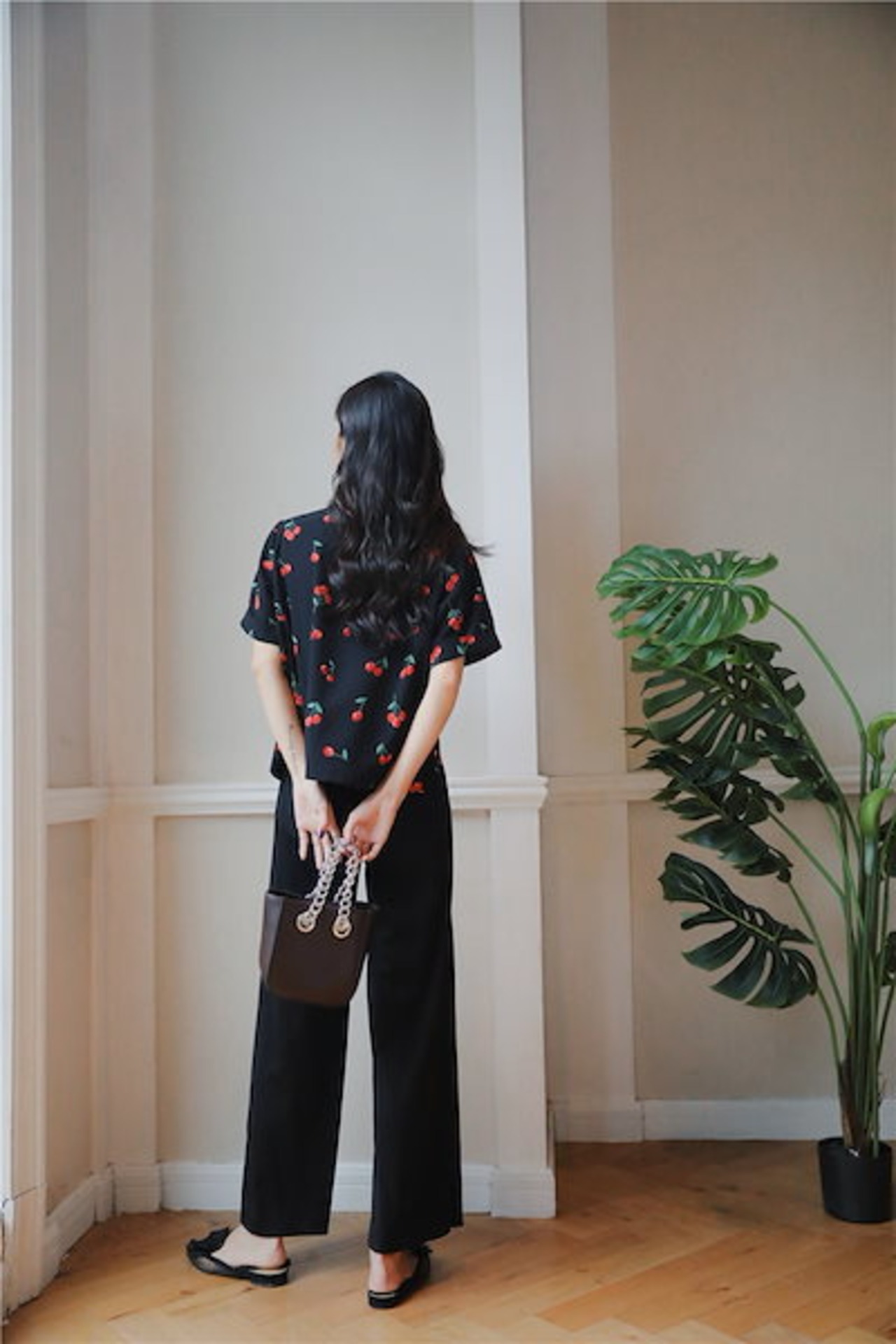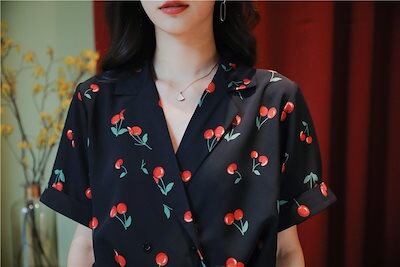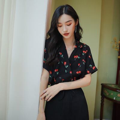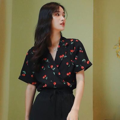 使える!シフォンブラウス今っぽシアーシャツサテンシャツ半袖夏服レディース可愛いサクランボ花柄シフォンシャツ韓国ファッション