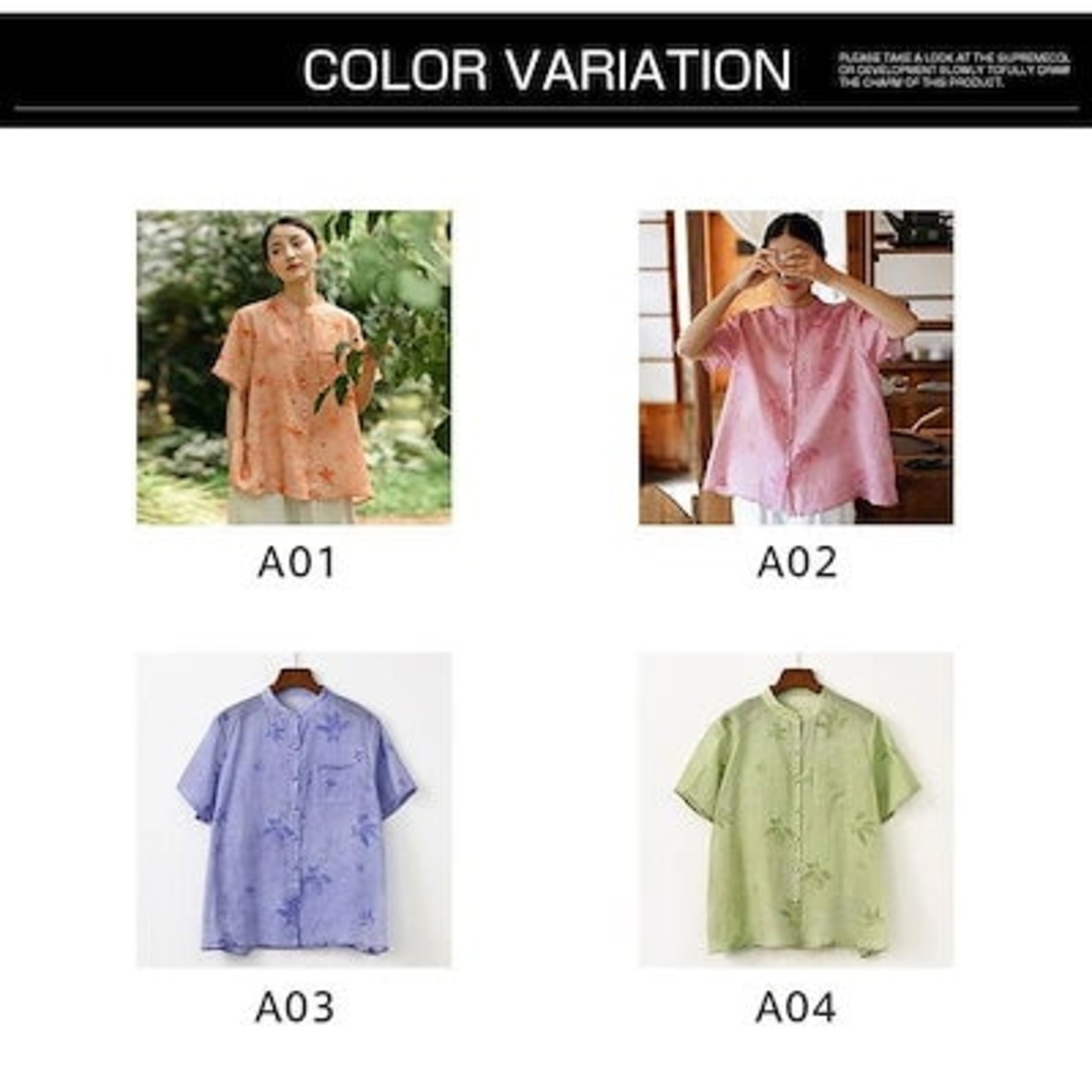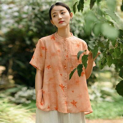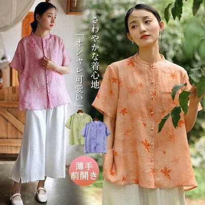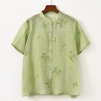 シャツ半袖レディース綿麻混ブラウス花柄個性的リネンシャツ体型カバー大きいサイズカジュアルトップス夏薄ゆったり柔らかい