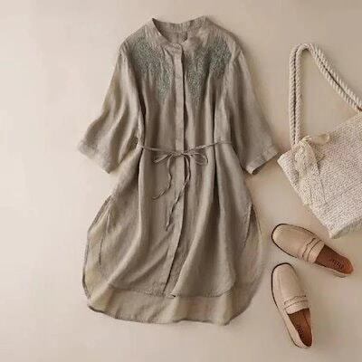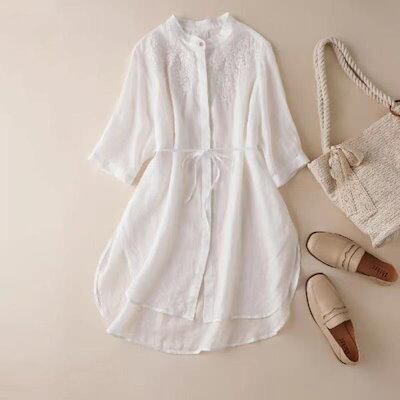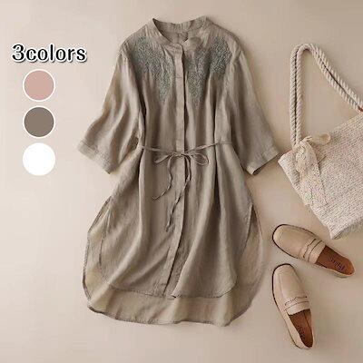 綿麻混ワンピースレディース夏春トップスロングシャツチュニックゆったりシャツワンピース5分袖リネンシャツ大きいサイズスリット