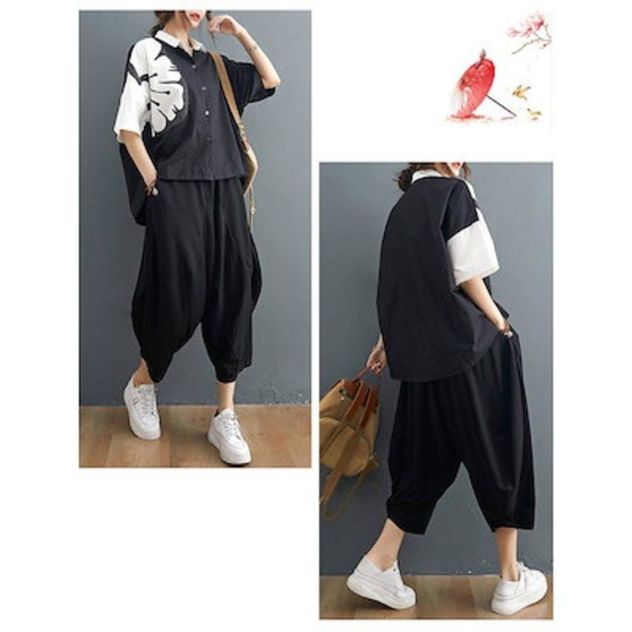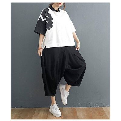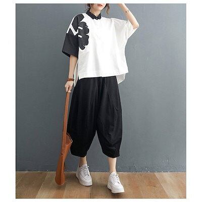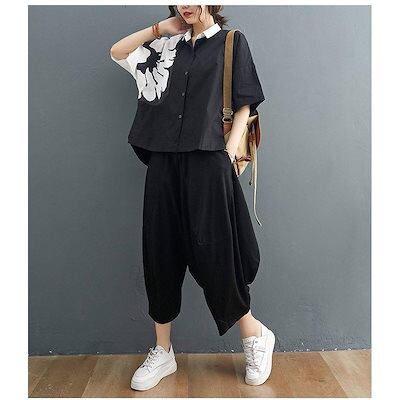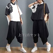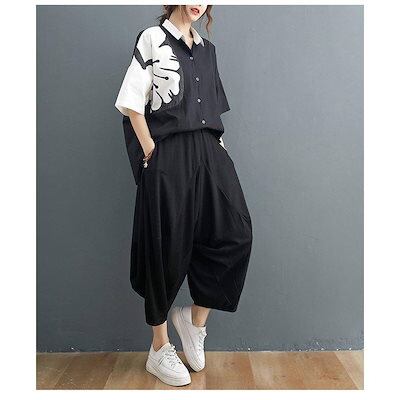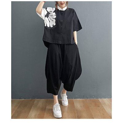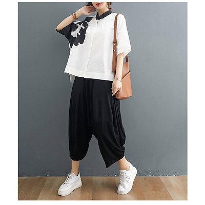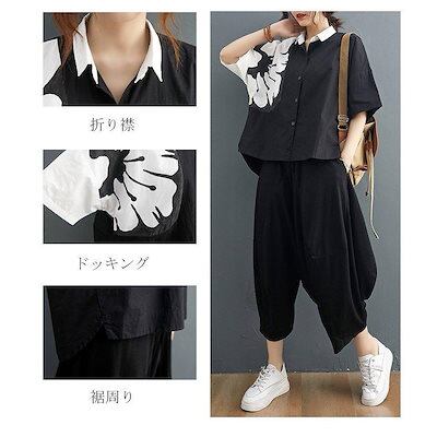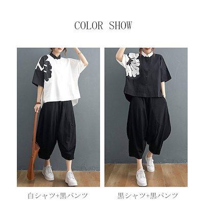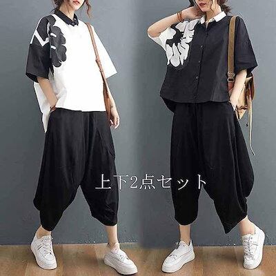 セットアップ レディース 夏物 セット 上下セット 2点セット トップス シャツ 半袖 夏 ズボン パンツ サルエルパンツ ショート丈 ゆったり おしゃれ