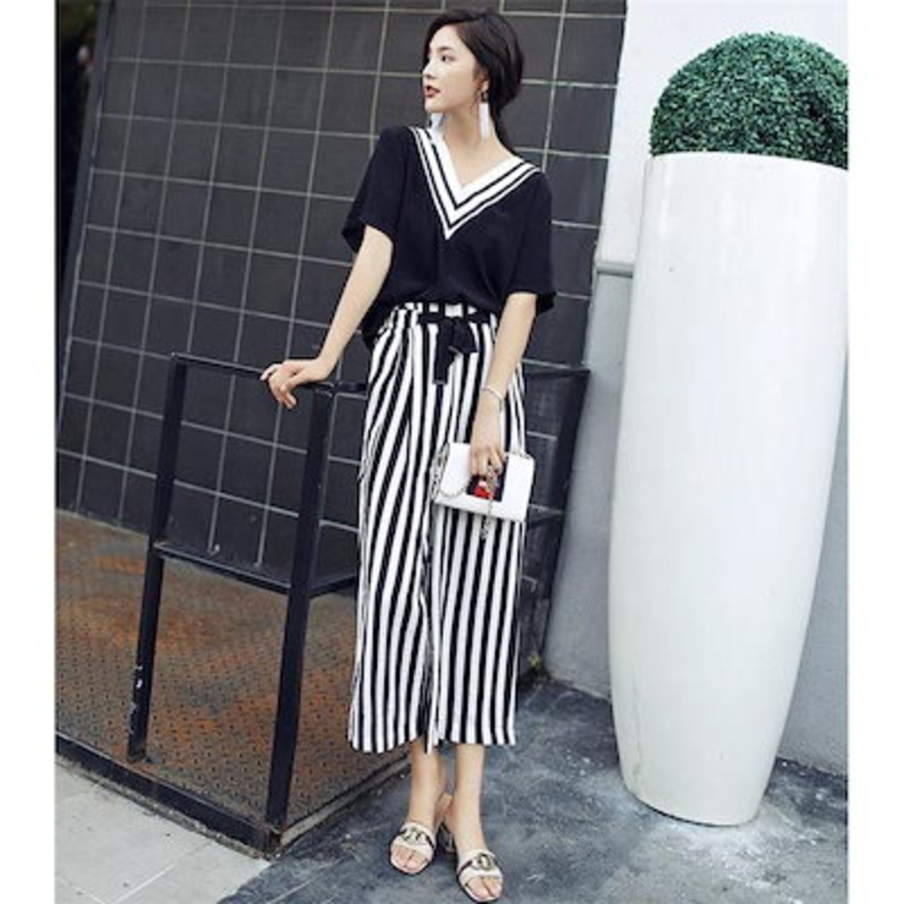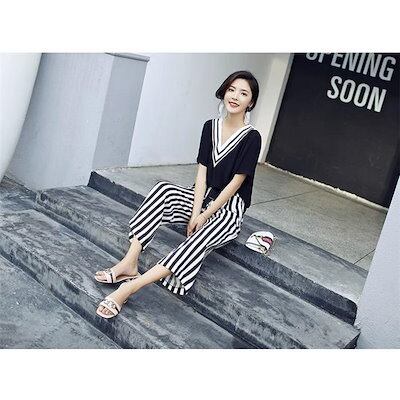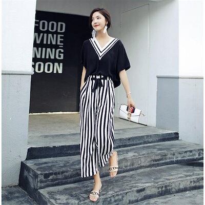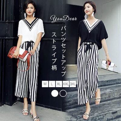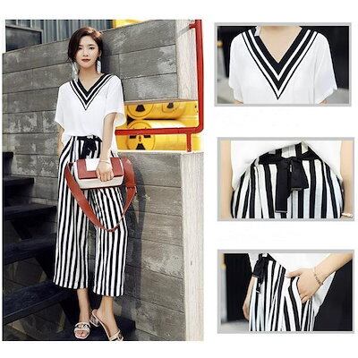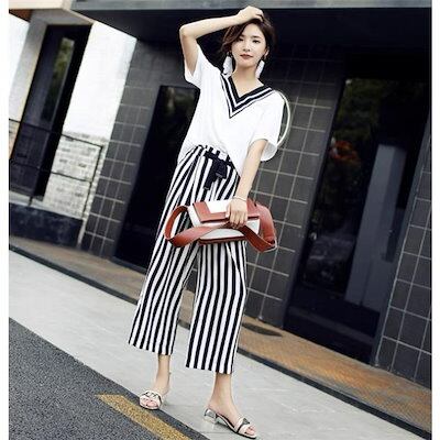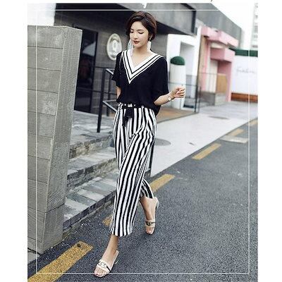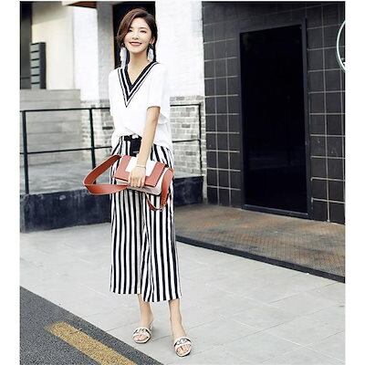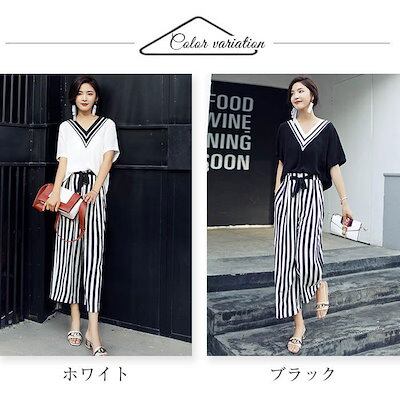 パンツセットアップ レディース 夏 上下セット ワイドパンツ ストライプ 2点セット tシャツ vネック 半袖 カジュアル きれいめ ロングパンツ 体型カバー 着痩せ
