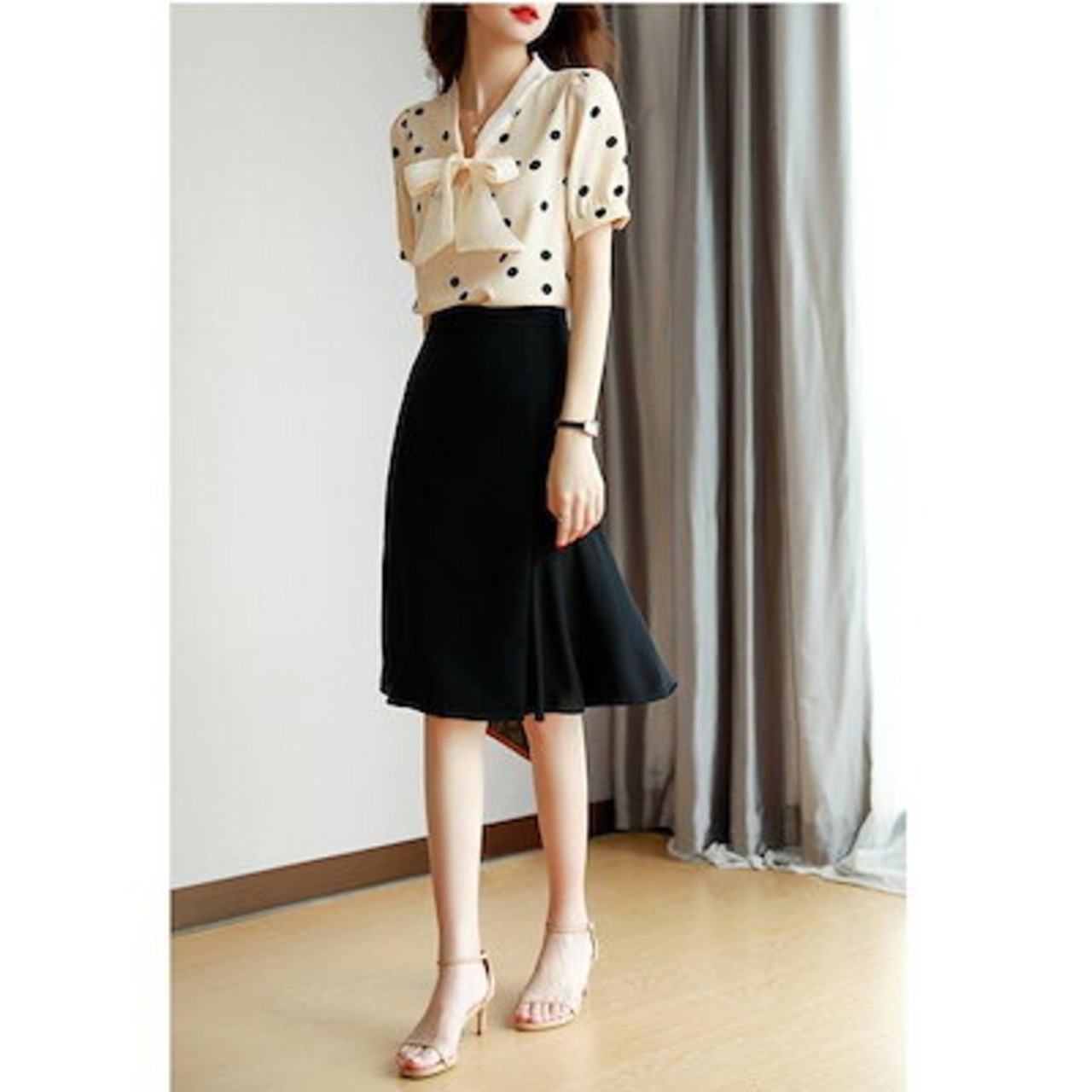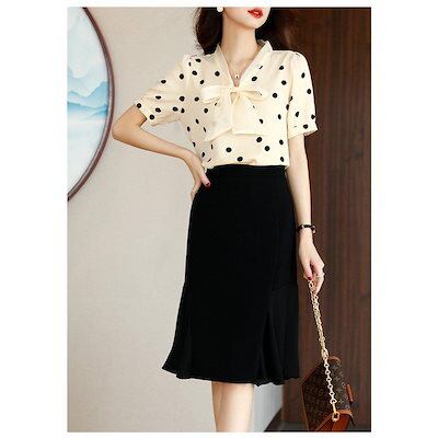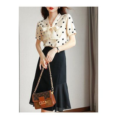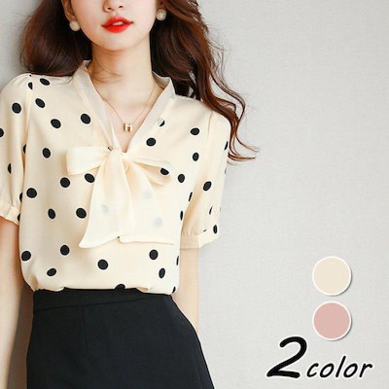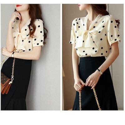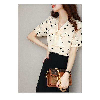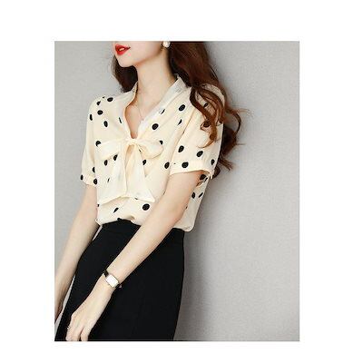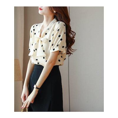 ブラウス レディース 40代 春夏 新作 オシャレブラウス シフォンシャツ 半袖 トップス ドット柄 リボン Vネック ブラウス パフスリーブ 大人 通勤 OL ゆったり