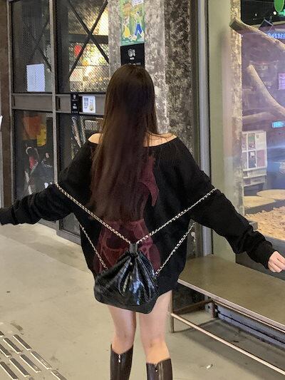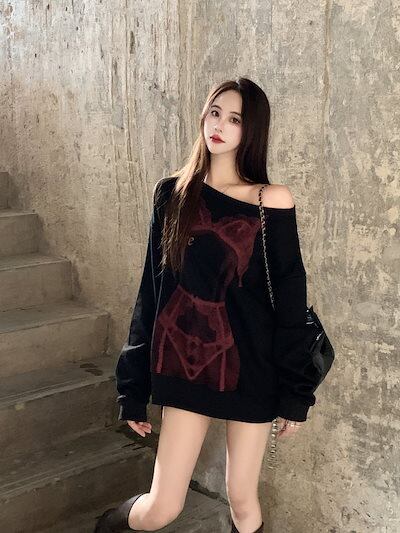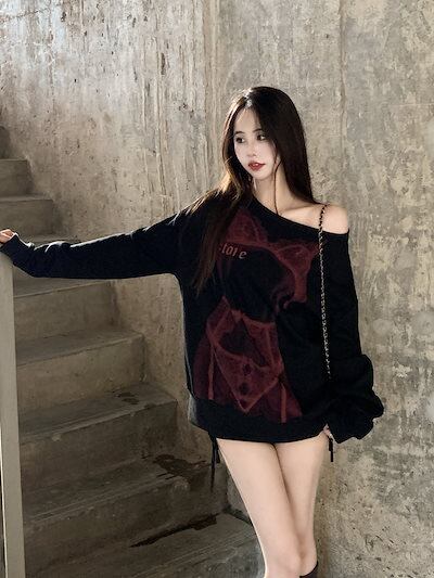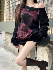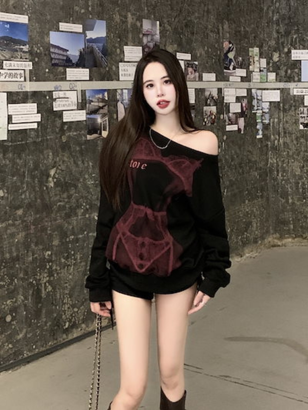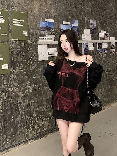 2024秋冬オフショルダー トップス セクシープリント スウェット オーバーサイズ ロンT トレーナー 長袖 韓国ファッション レディース