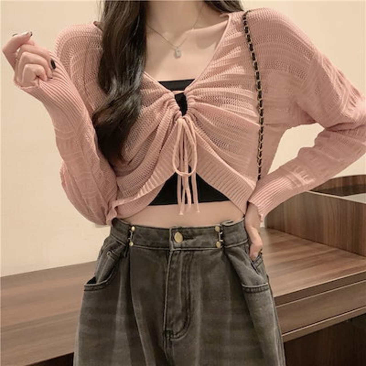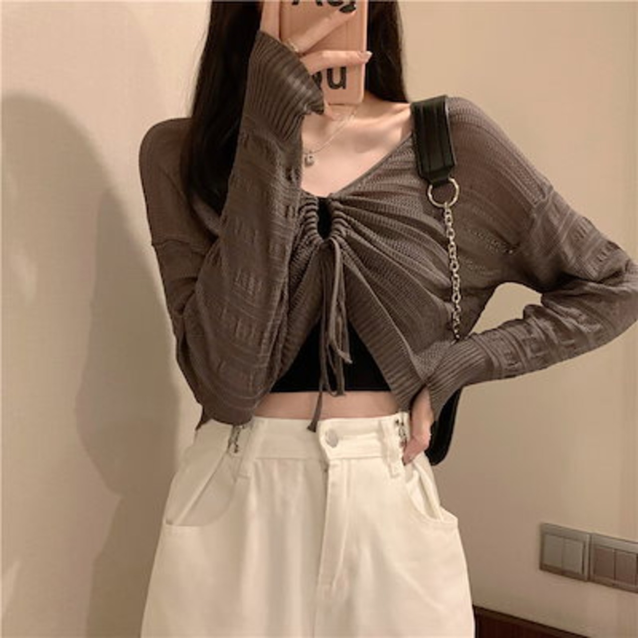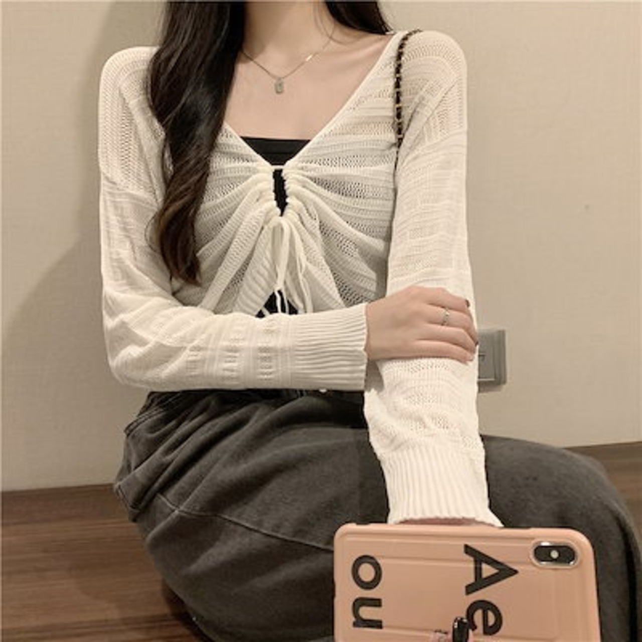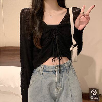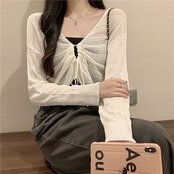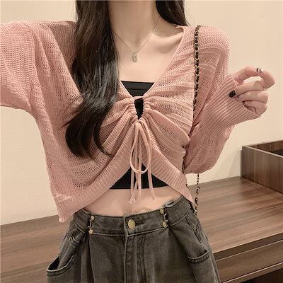 2024 春秋韓国 ショート丈 薄手 カーディガン トップス 長袖 紫外線対策 UV対策 羽織り加工 きれいめ ライトニット オフィス OLネックカジュアルフレンチフェミニンファッション韓国レディース