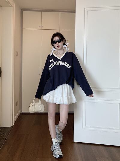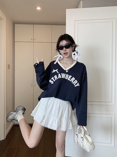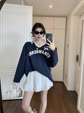 2024 秋冬トレンド トップス Vネック長袖かわいいバイカラーTシャツレディース韓国風衣装ルーズゆったりカジュアルおしゃれサイズスリーブシルエットファッション系サイドシャツフットバイカラーニュートロ