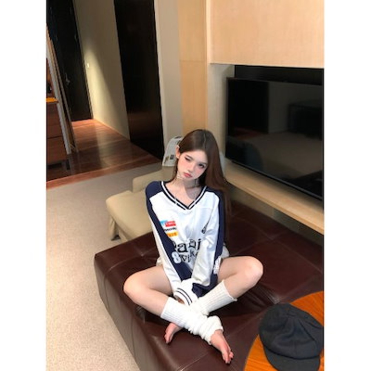 2024 秋冬 トレンドVネック トップスバイカラー長袖 かわいいK-POPTロング白レディース韓国風ロゴ衣装ルーズゆったりカジュアルおしゃれサイズスリーブシルエットファッション系サイドシャツフット春