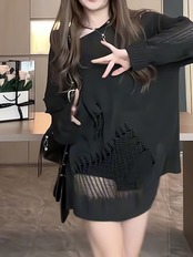 2024秋冬 長袖 ニット トップスストリート黑カジュアエコルシルエットプルクルーネックファッション加工色っぽ 女っぽ カジュアル 大人っぽ 上品 サイズフェミニンゆったりレディース系透かし編み