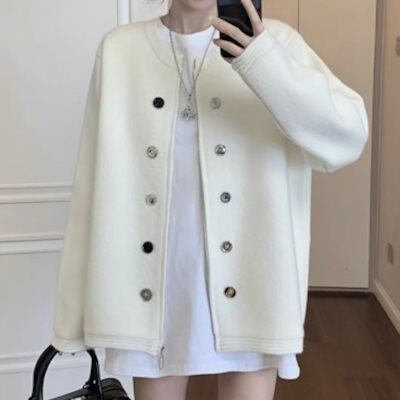 2024秋冬トップス ニット カーディガン ダブルボタン ラウンドネック ジップ チャック 長袖 秋 白 ホワイト おしゃれ かわいい 韓国ファッション レディース お出かけ