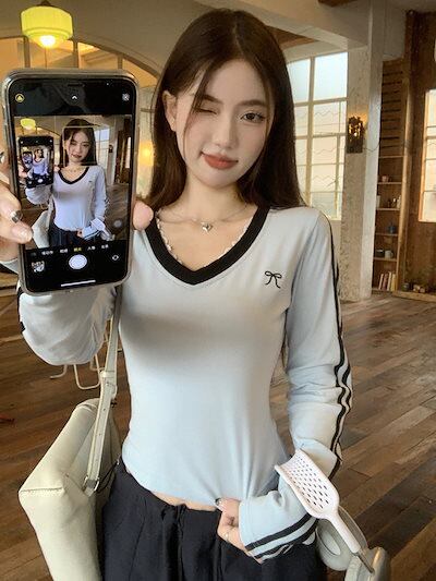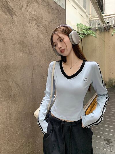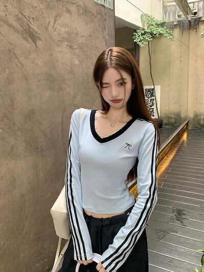 2024 秋冬トップス Tシャツ 長袖 Vネック ストライプ Vネック スリム 細見え 秋 ライトブルー おしゃれ かわいい 韓国系ファッション衣装 レディース お出かけ