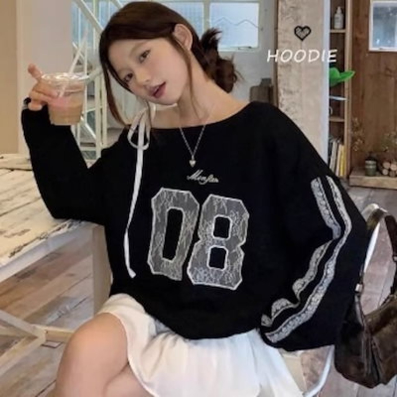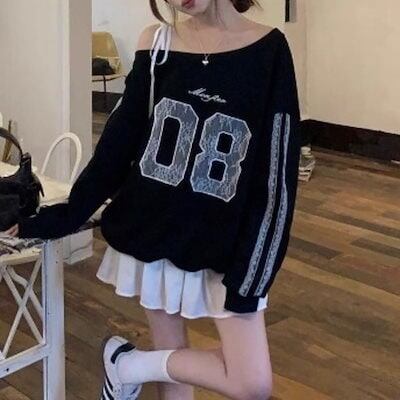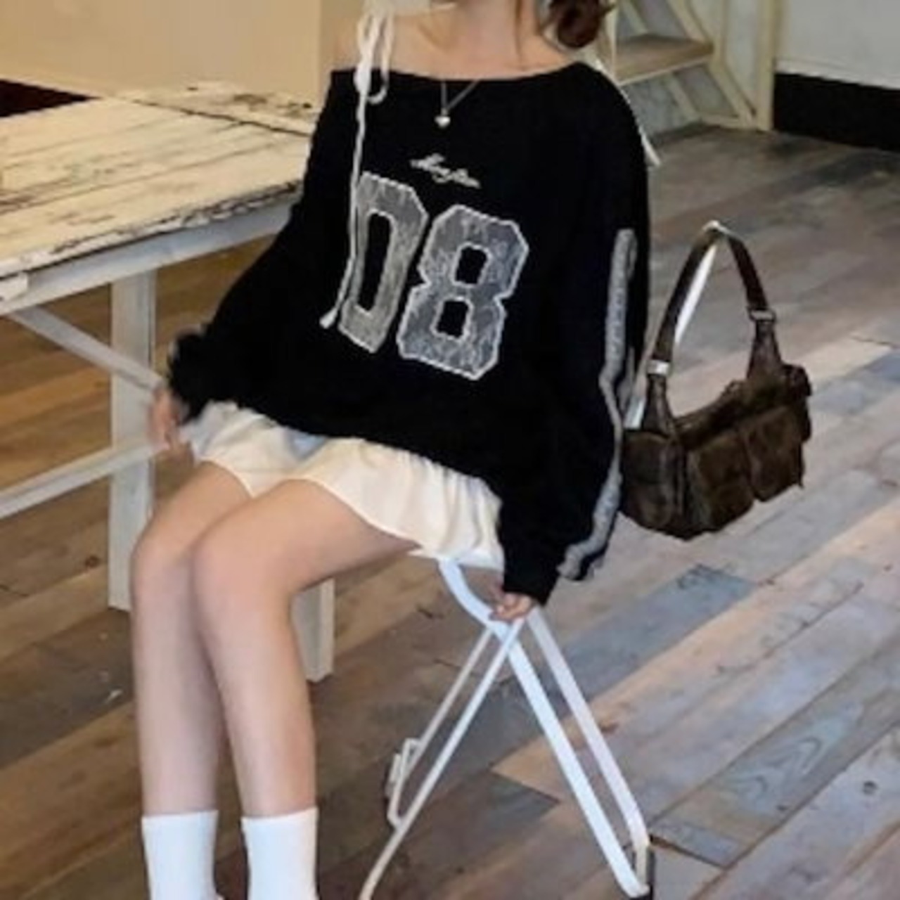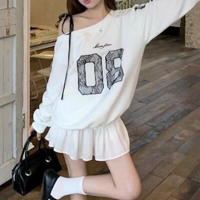 2024 秋冬トップス スウェット 長袖 ラウンドネック 肩見せ 数字 08 レース ストライプ ゆったり 秋 白 黒 おしゃれ かわいい 韓国ファッション衣装 レディース お出かけ