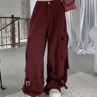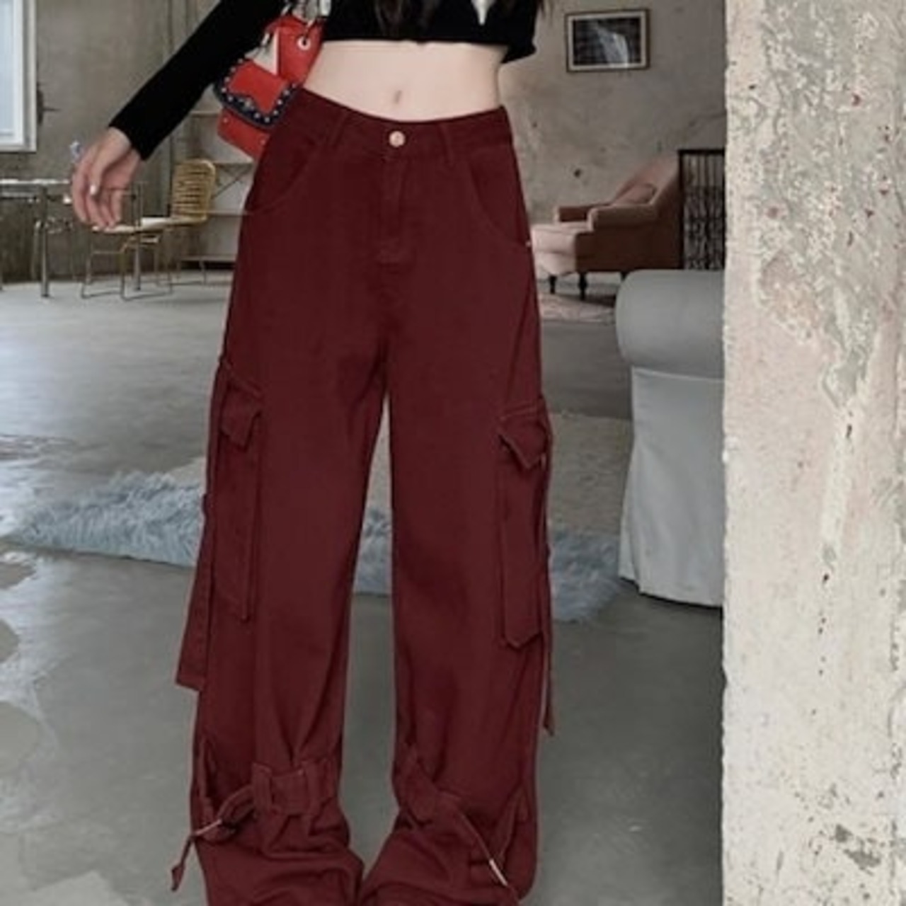 2024秋冬パンツ デニム ジーンズ ロング丈 ワイド ハイウエスト 美脚効果 脚長効果 細見え 秋 エンジ レッド 赤 おしゃれ かわいい 韓国ファッション レディース お出かけ
