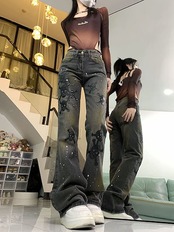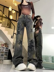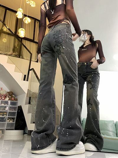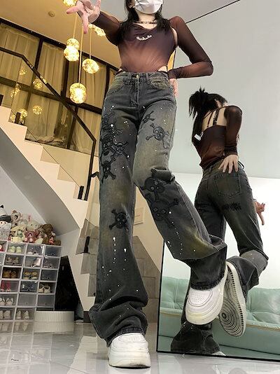 デザイン感のあるインクレドクロ貼り革刺繍スリムスリムスリムジーンズレディースストレートカジュアルパンツ