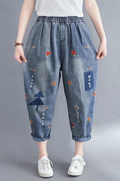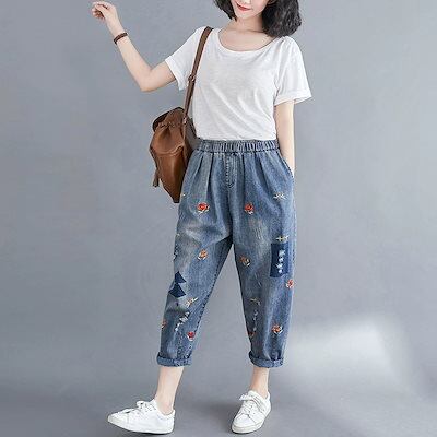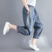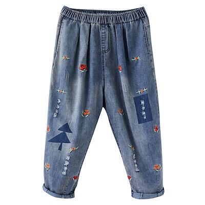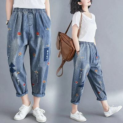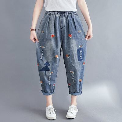 デニムボトムス大きいサイズダメージジーンズ刺繍ハーレムズボンが痩せているカジュアルな九分パンツジーンズ