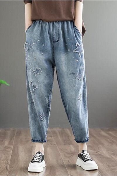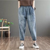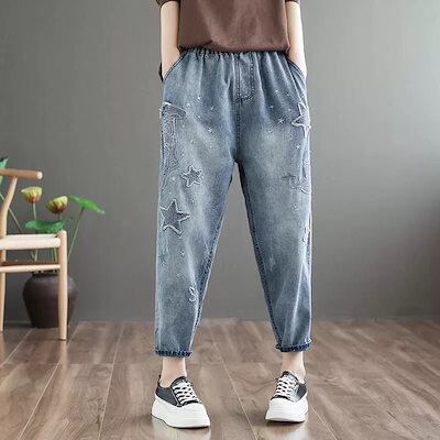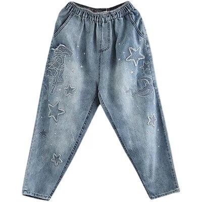 大きいサイズ綿デニムの刺繍デニムボトムス新型文芸刺繍ウエストゴムパンツ9分のズボンデニムボトムス