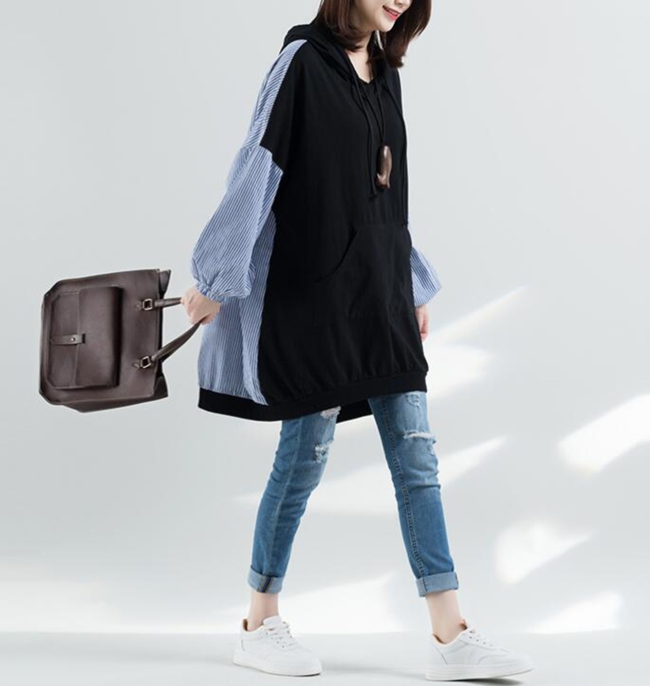 パーカートレーナースウェット切り替えフードストライプボリュームシャツレディース長袖