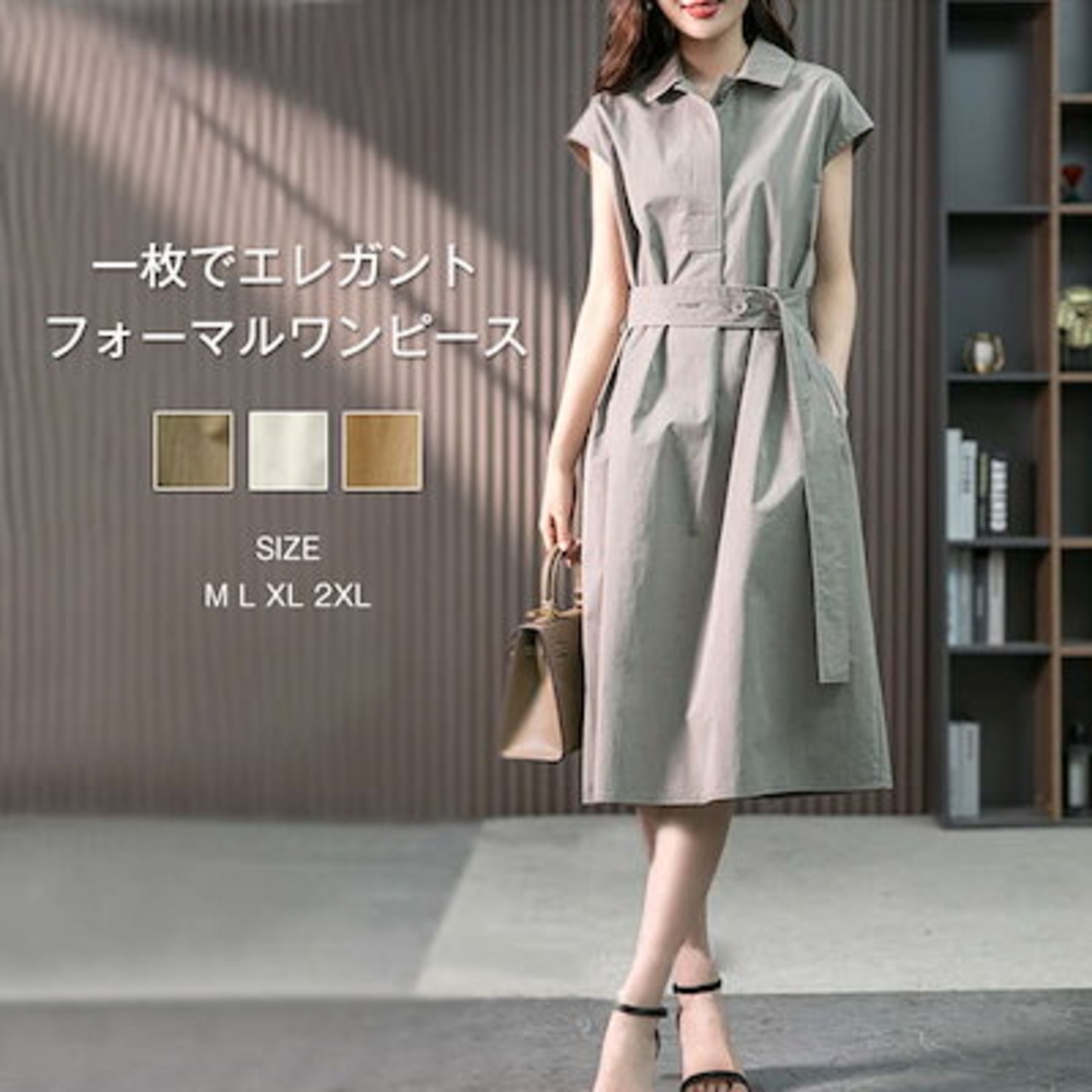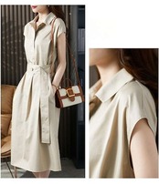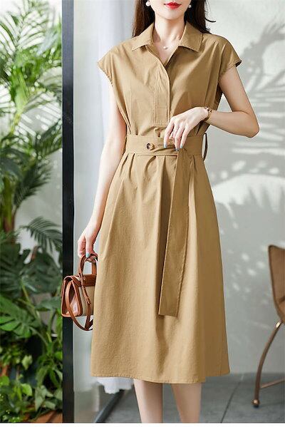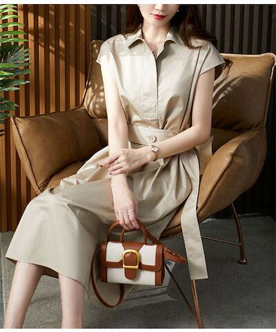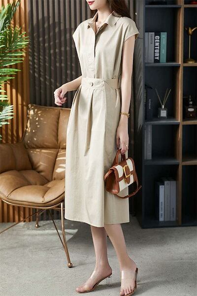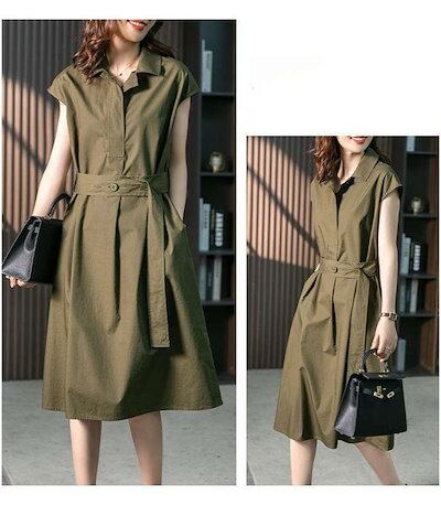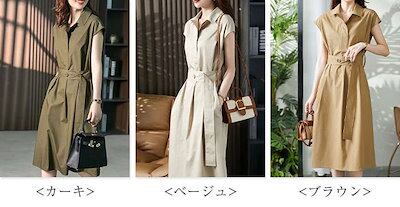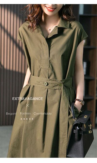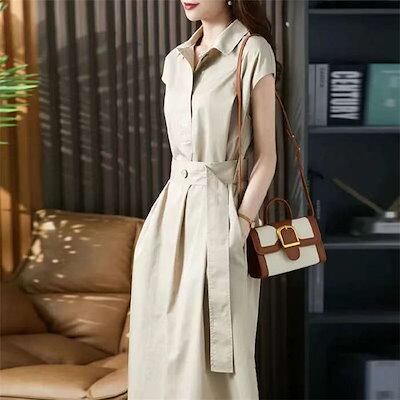 トレンチワンピース レディース シャツワンピース 春 夏 フレンチスリーブ ワンピース ミモレ丈 ウエストマーク ベルト スーツ スーツワンピース 半袖ワンピ 襟付き 無地 カジュアル きれいめ フォ
