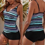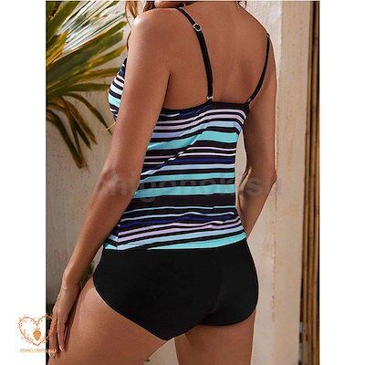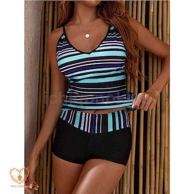 セット タンクスーツ セパレート お洒落 ハイウエスト ショートパンツ 大きいサイズ 体型カバー ストライプ Vネック 水着レディース ビキニママ水着