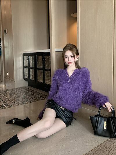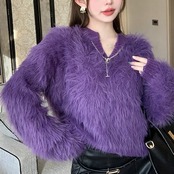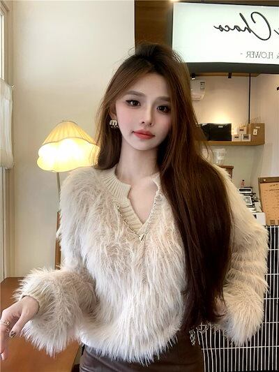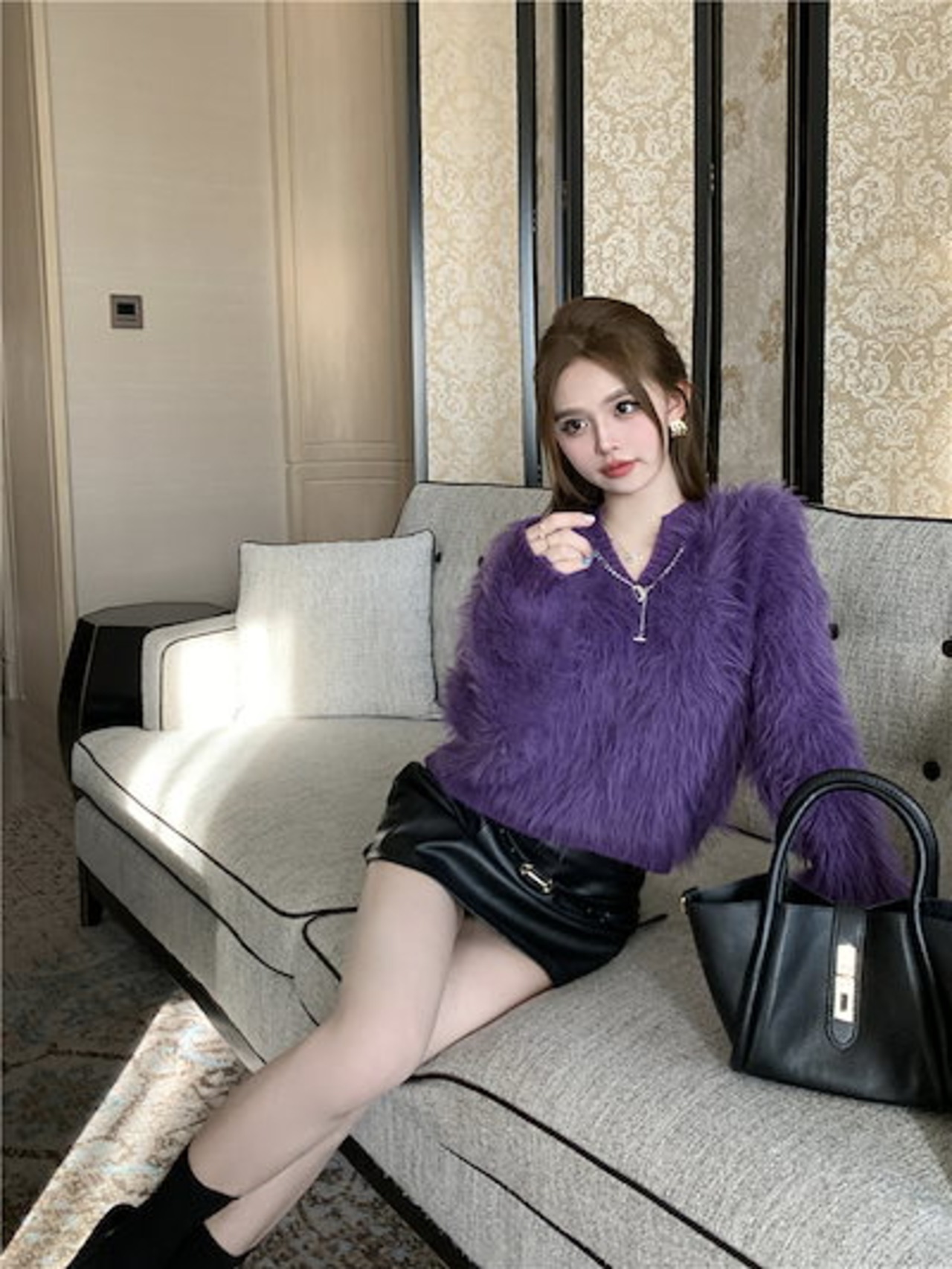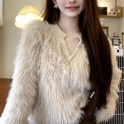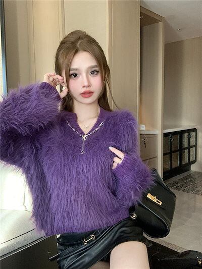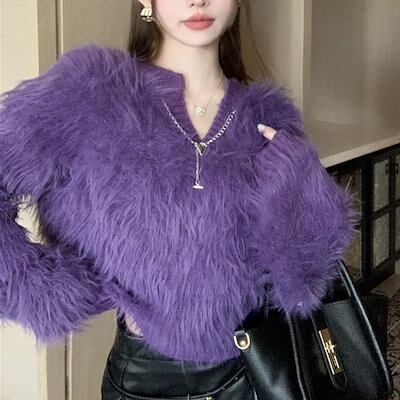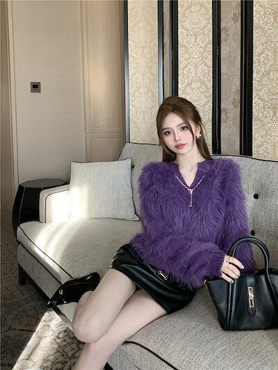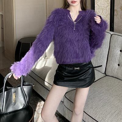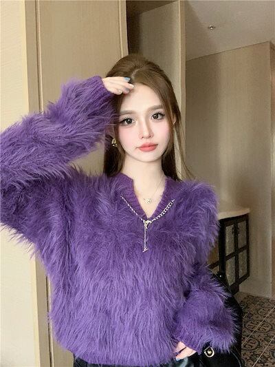 モヘアニット レディース トップス ニット セーター 長袖 ボリューム袖 Vネック フェミニン もこもこ ふわふわ 大人可愛い 上品 かっこいい 個性的 存在感 とろみ感 無地 秋 冬 デート