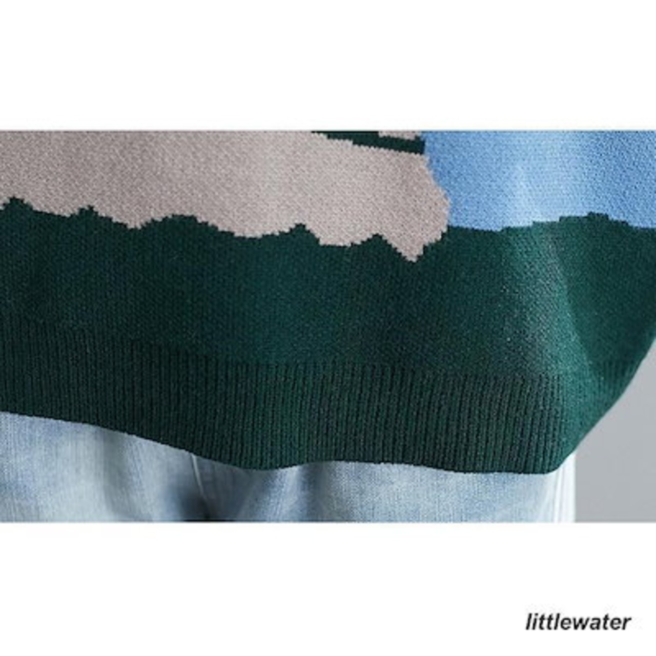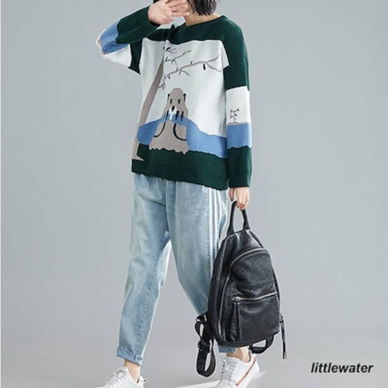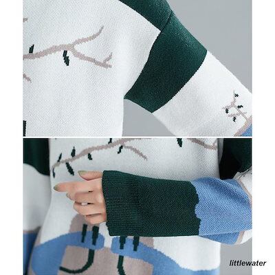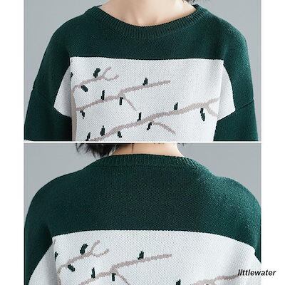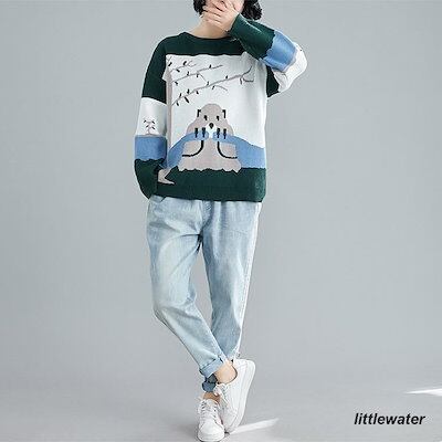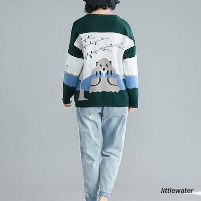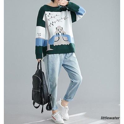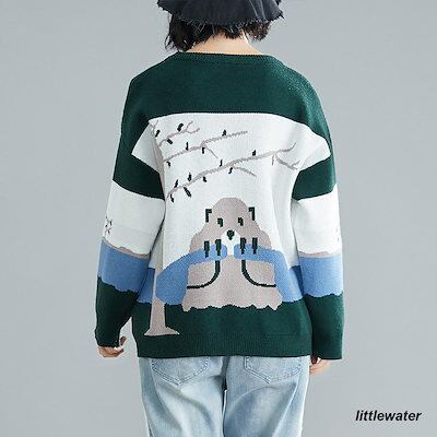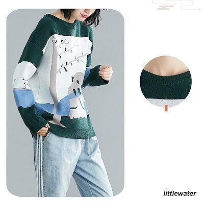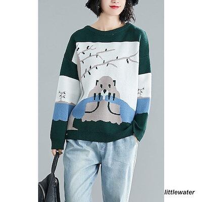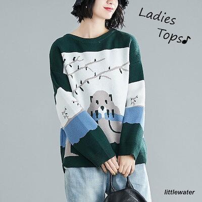 【新作】セーター ニット レディース 女性 トップス 長袖 袖リブ 丸首 ラウンドネック クルーネック 裾リブ 総柄 アニマル 動物 グリーン カジュアル ポ