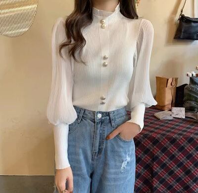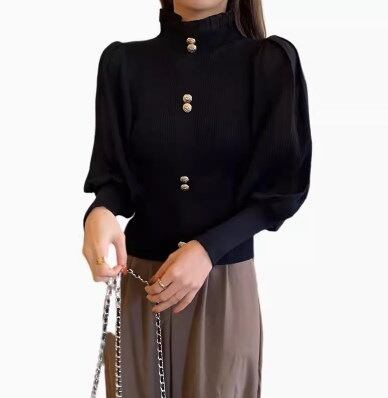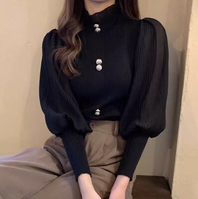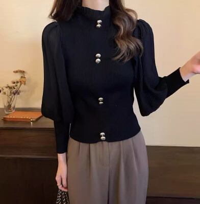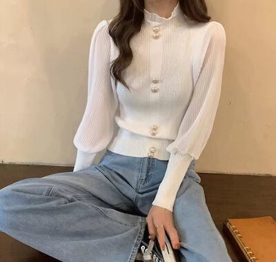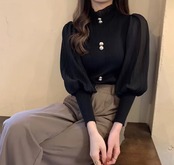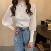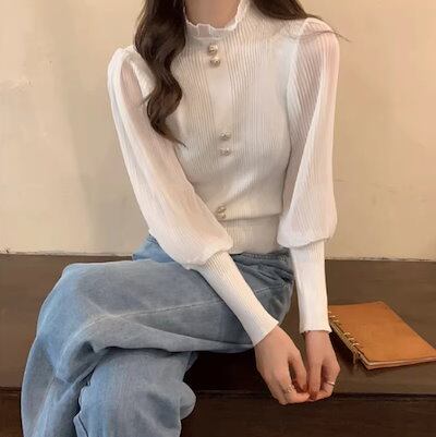 レディース トップス カットソー ニット セーター Gパン 長袖 ボリューム袖 レース フリル リブ 伸縮性 ボタン 切り替えデザイン 大人可愛い きれいめ シンプル カジュアル 上品 おしゃれ