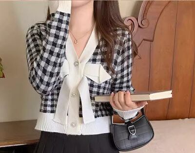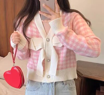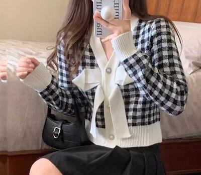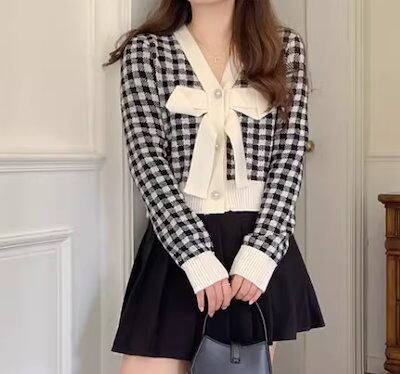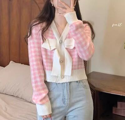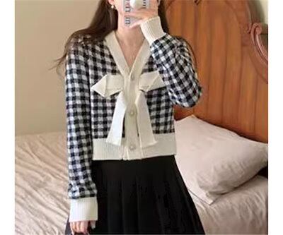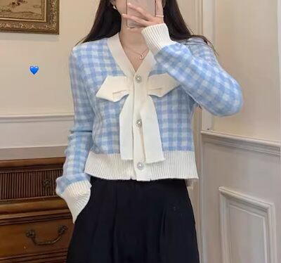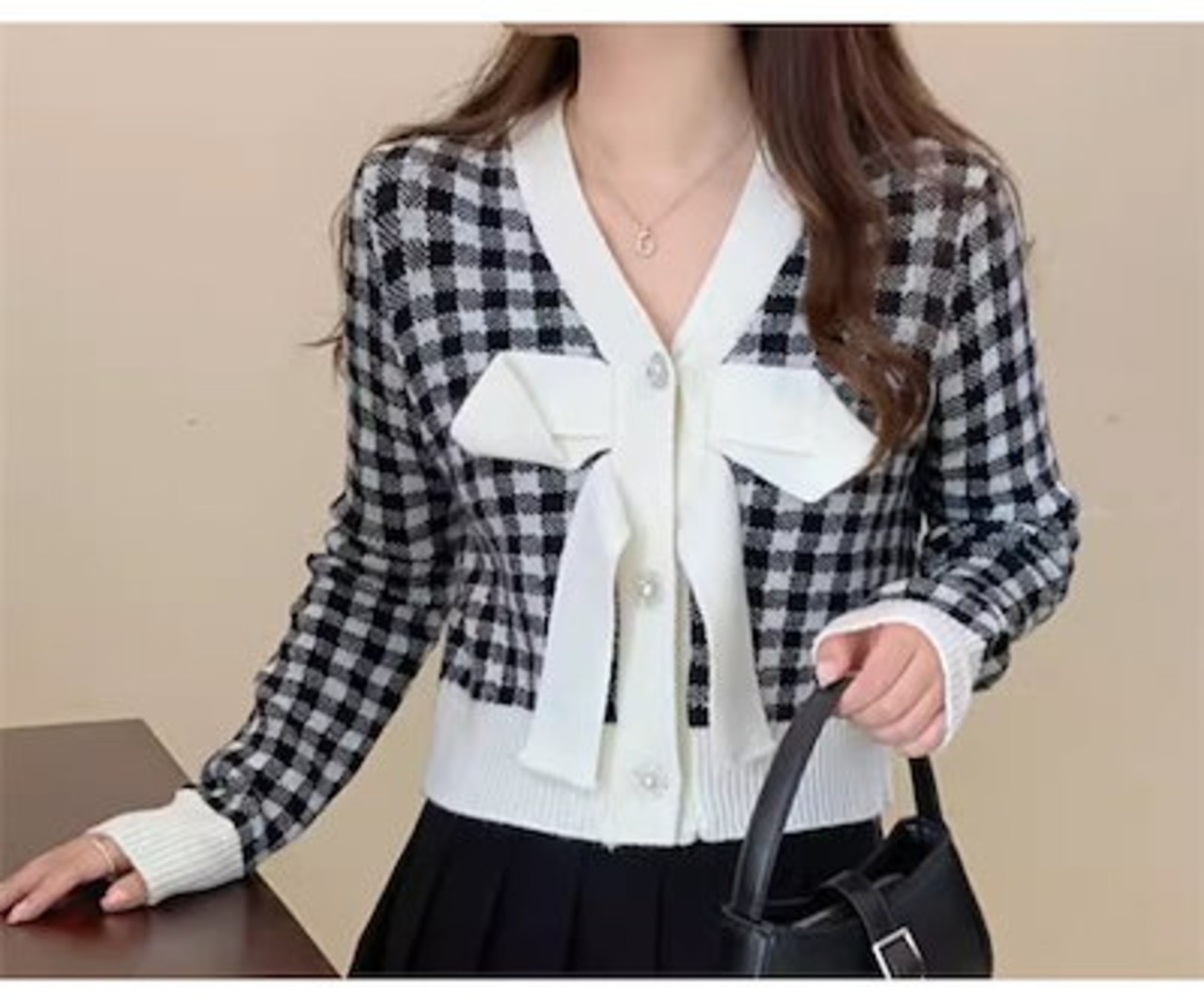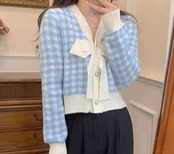 レディース トップス ニット セーター カーディガン ショート クロップド丈 長袖 Vネック フェミニン リボン 前開き ボタン 薄手 かわいい 大人可愛い きれいめ カジュアル 上品 おしゃれ