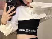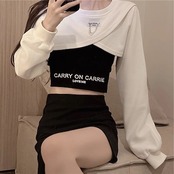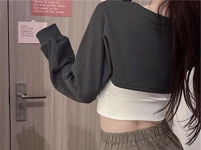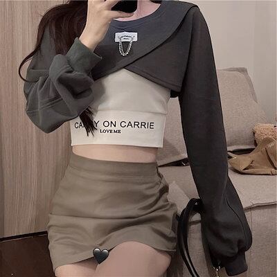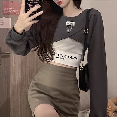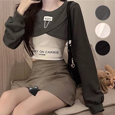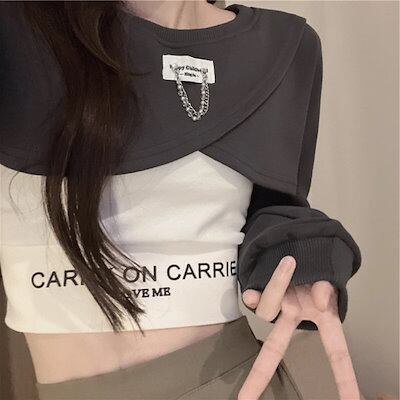 3色展開 シックな香港スタイルのベスト レディース トップス ロンT カットソー セーター ベスト キャミソール Tシャツ ショート クロップド丈 長袖 ラグラン ラウンドネック カシュクール 細身
