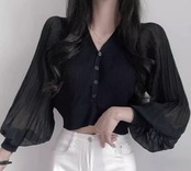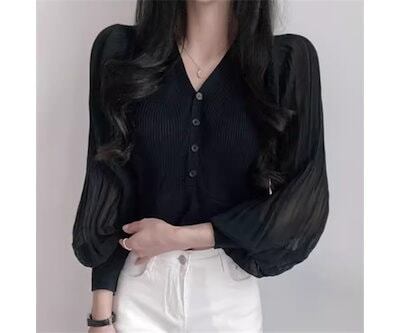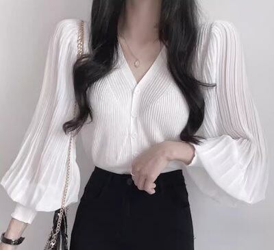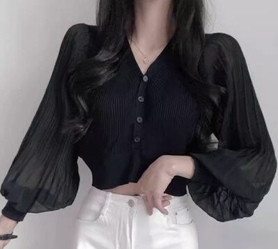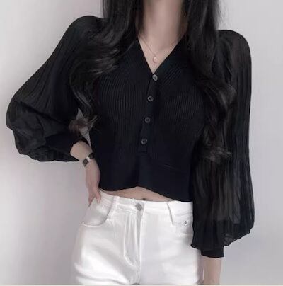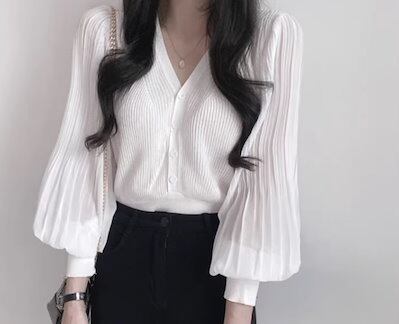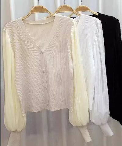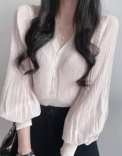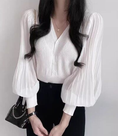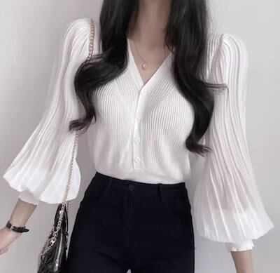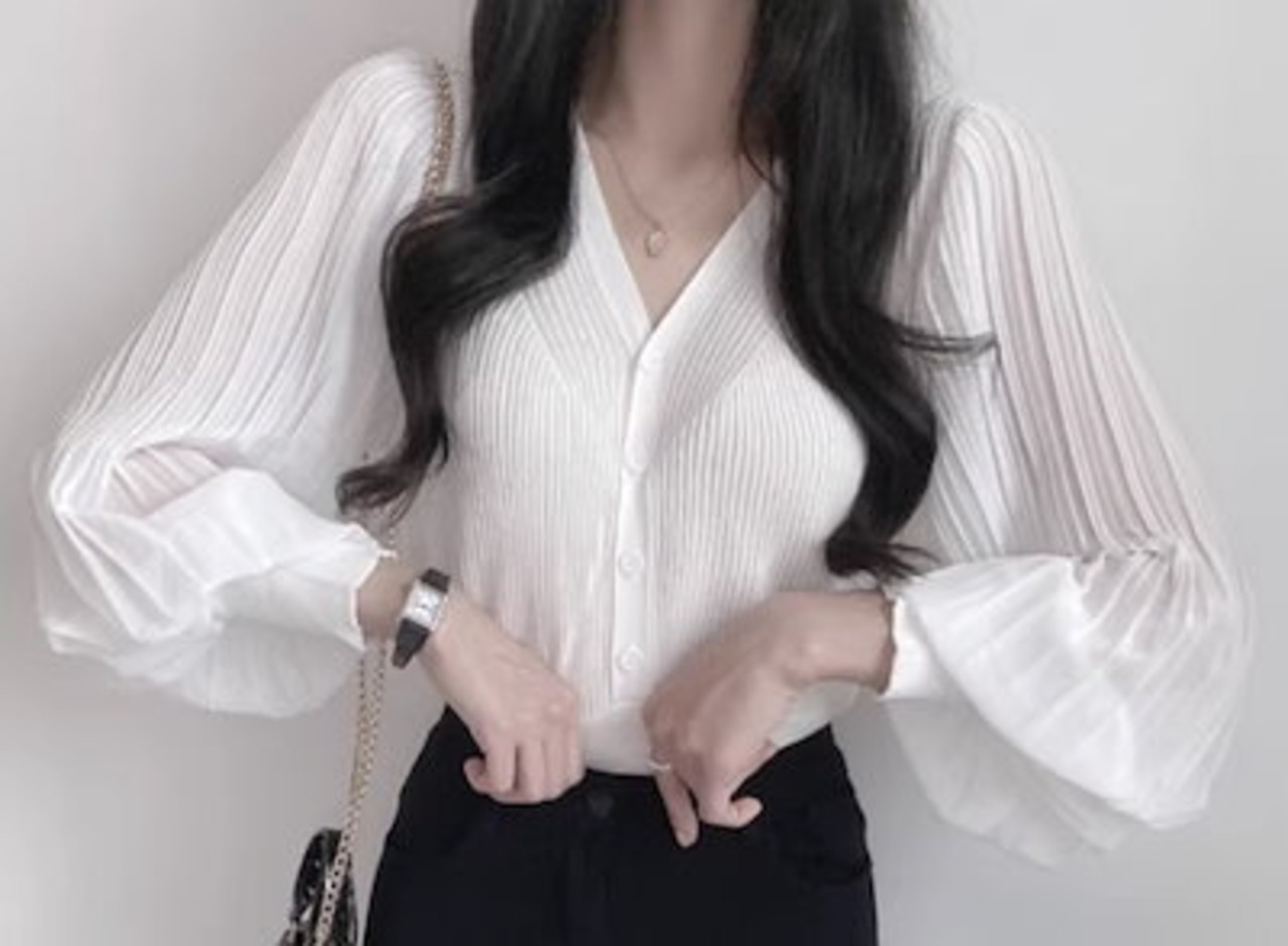 レディース トップス ニット カーディガン ショート クロップド丈 長袖 ボリューム袖 バルーン袖 ランタンスリーブ Vネック ストレート フェミニン プリーツ 前開き ボタン 薄手 ストレッチ