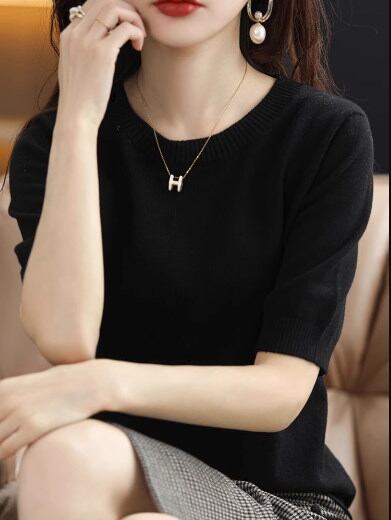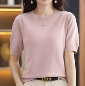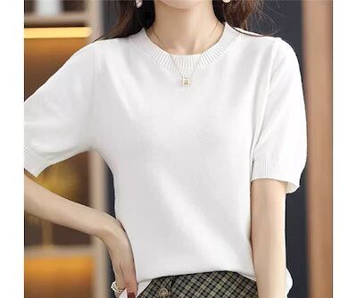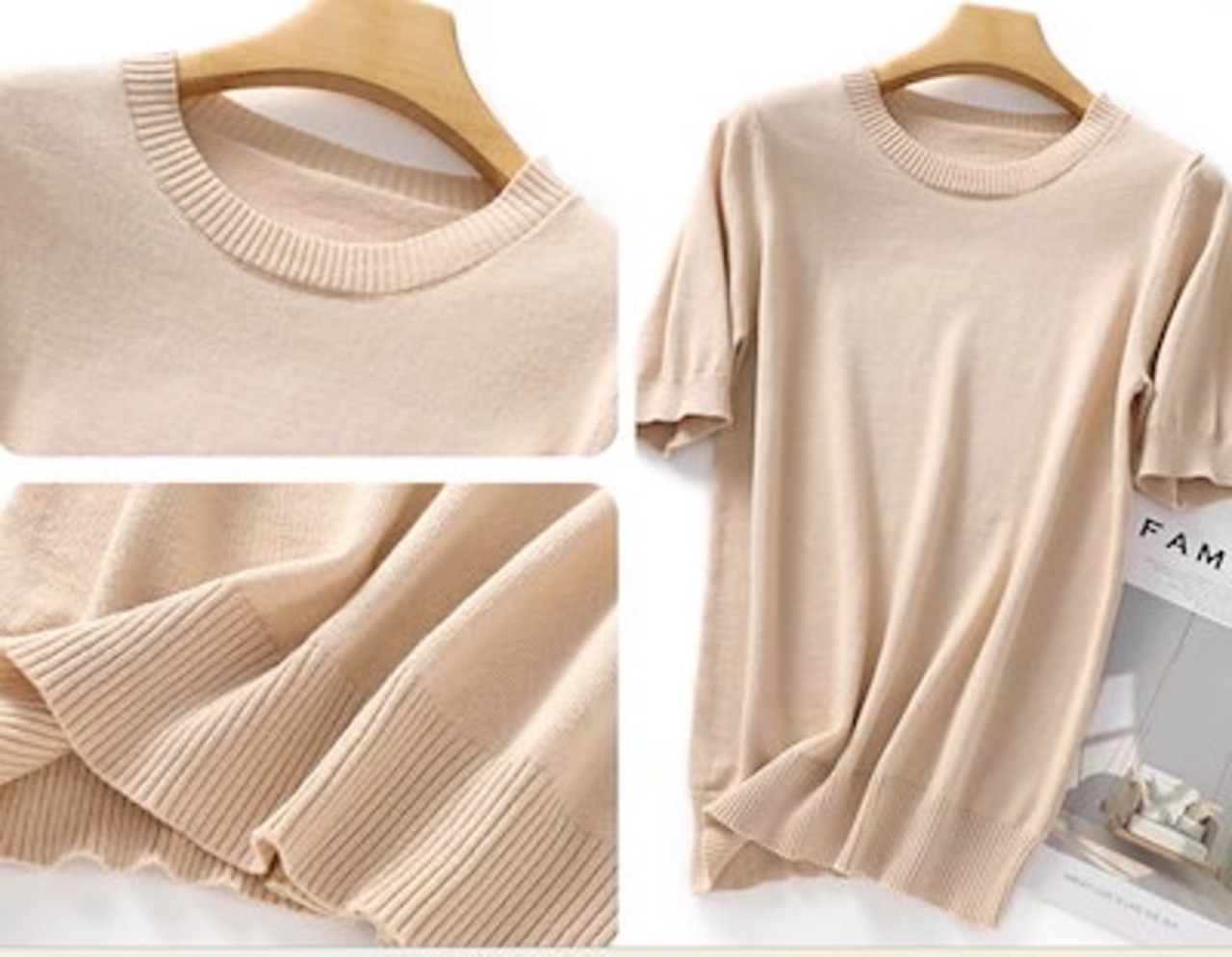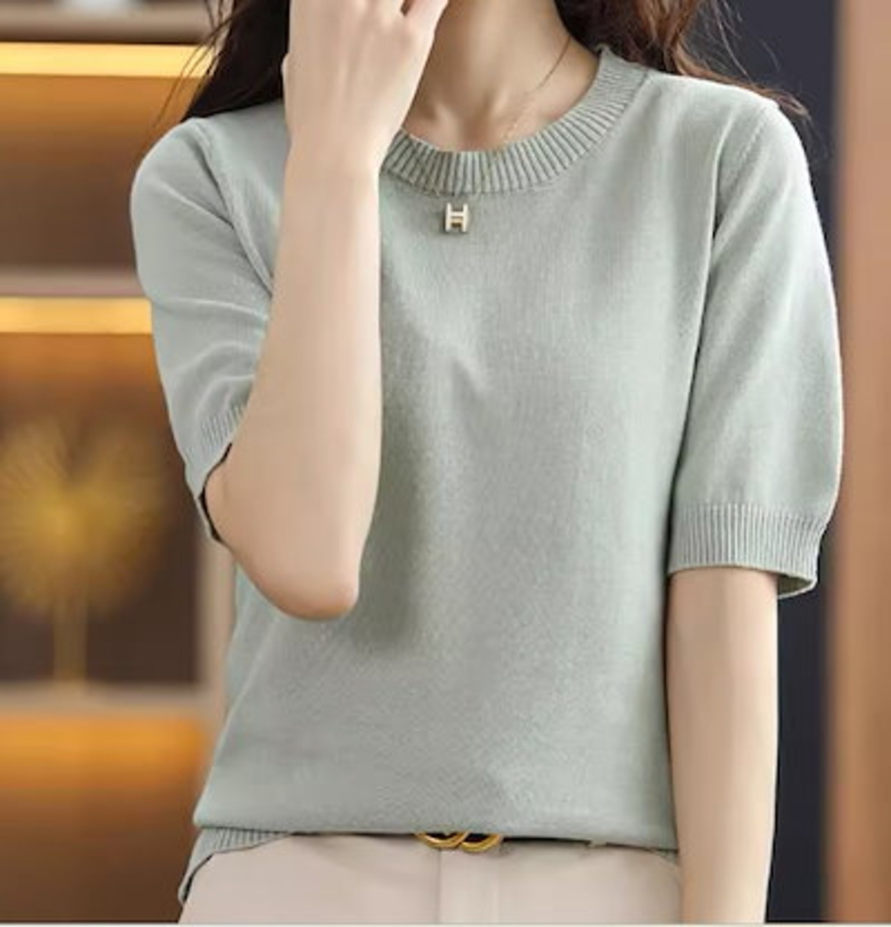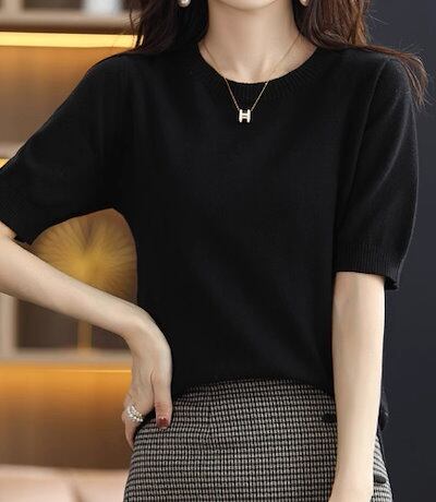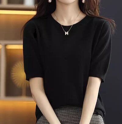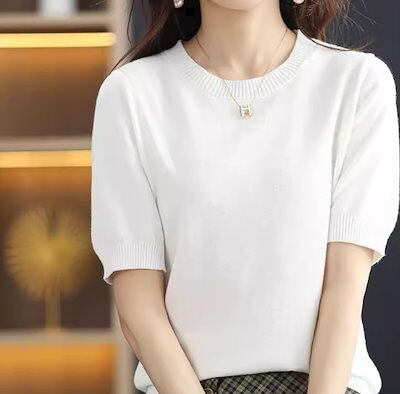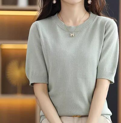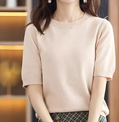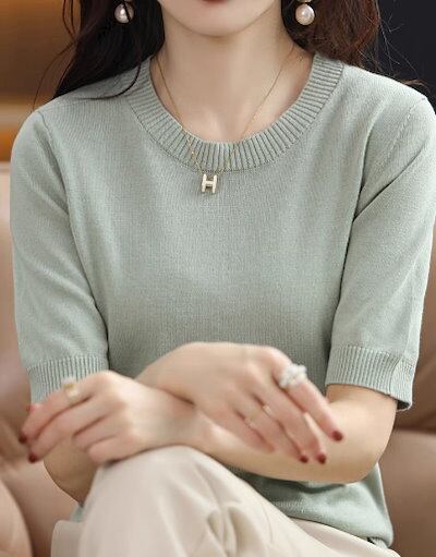 レディース トップス カットソー ニット セーター プルオーバー サマーセーター サマーニット ミドル丈 半袖 5分袖 ラウンドネック フェミニン かわいい 大人可愛い きれいめ シンプル カジュアル