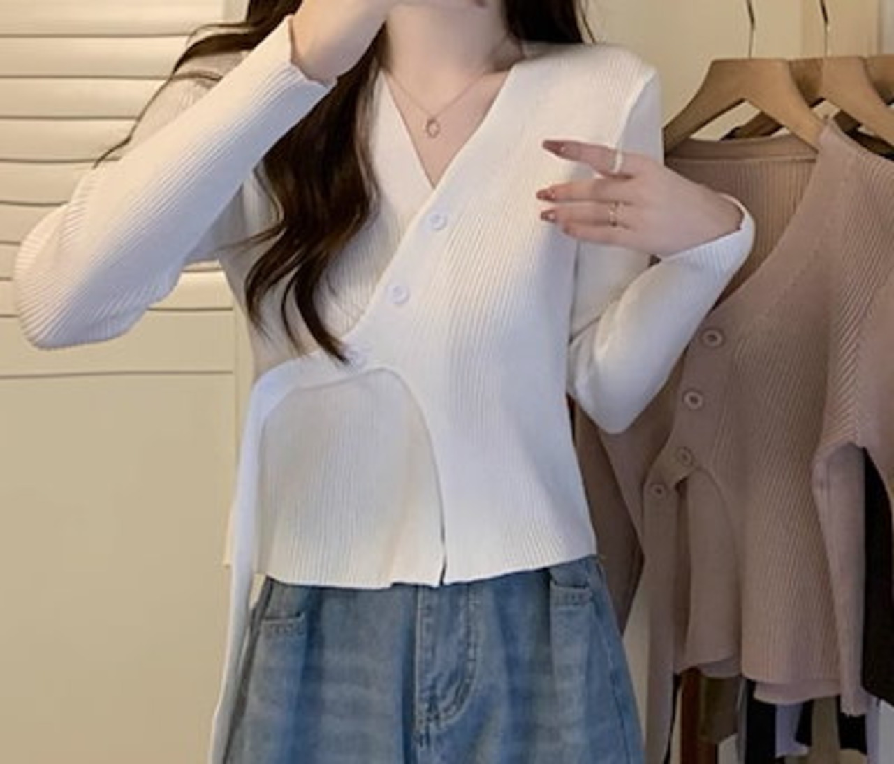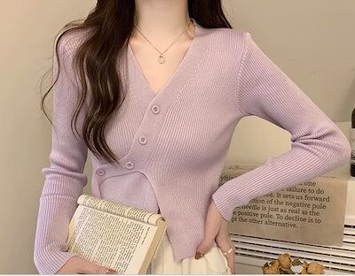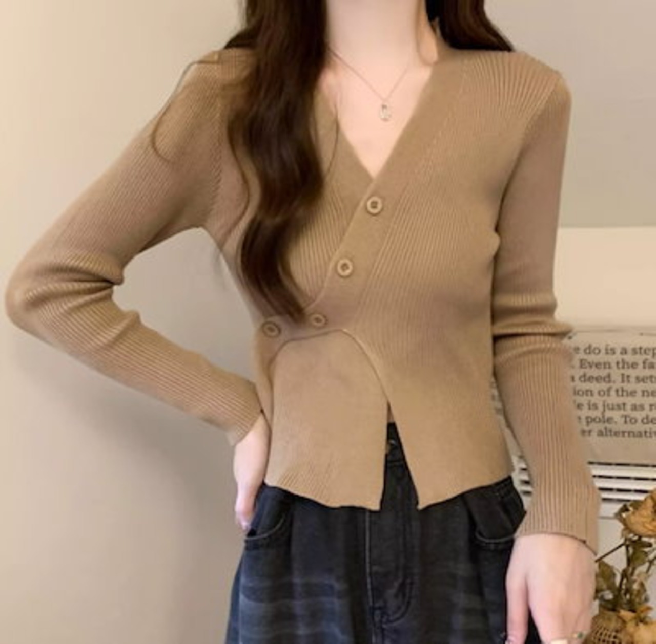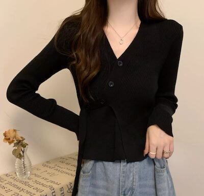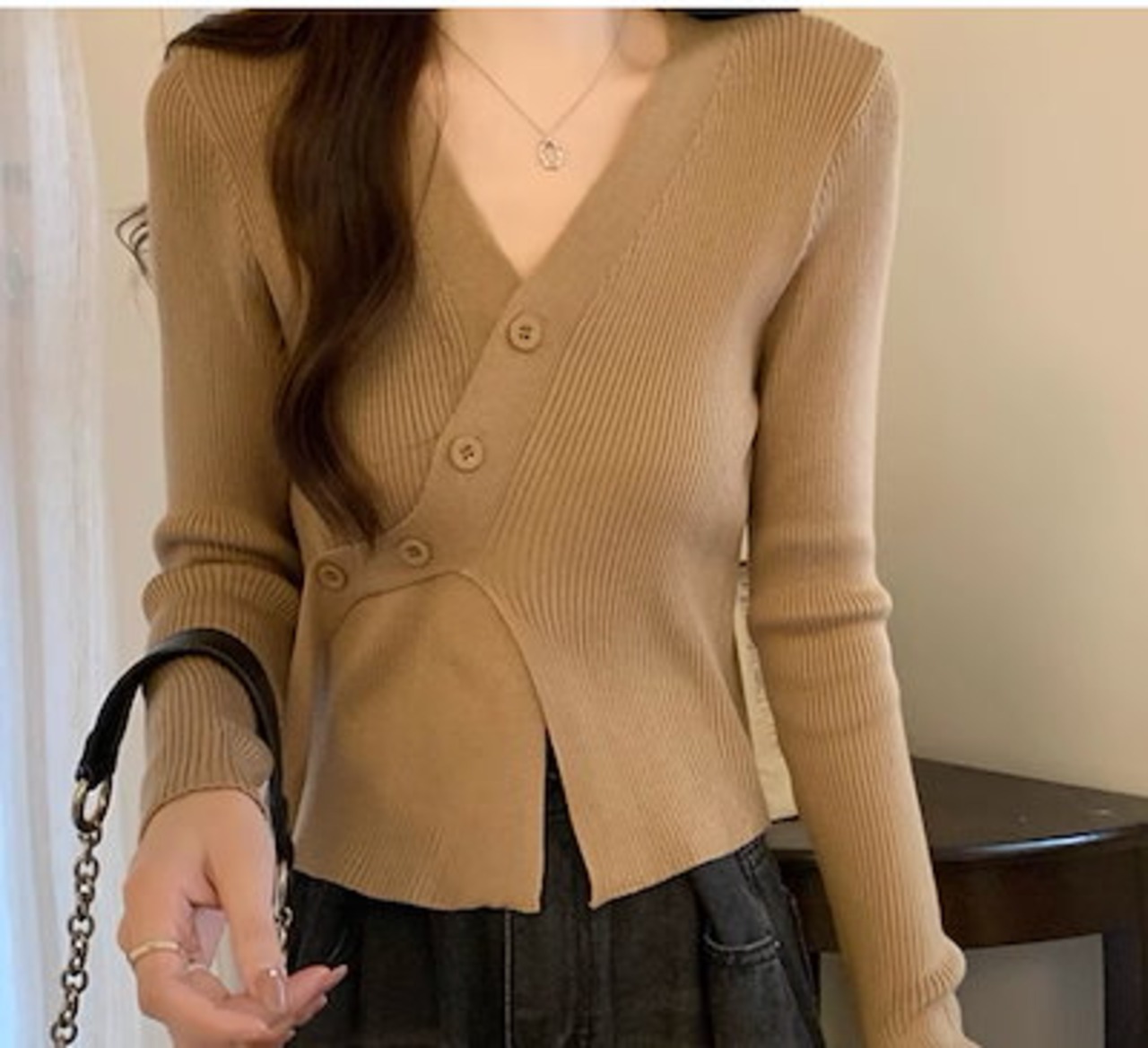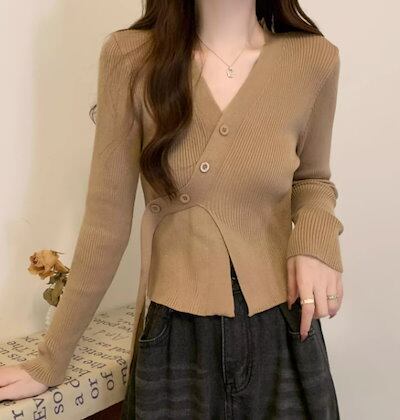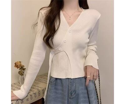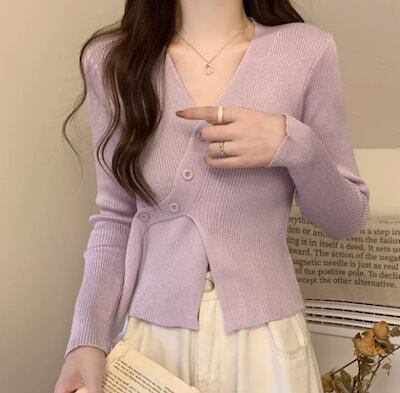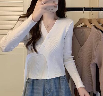 レディース トップス ニット セーター ショート アシンメトリー クロップド丈 左右非対称 長袖 Vネック タイト スリム 細身 スマート ボタン ストレッチ 伸縮性 かわいい 大人可愛い きれいめ