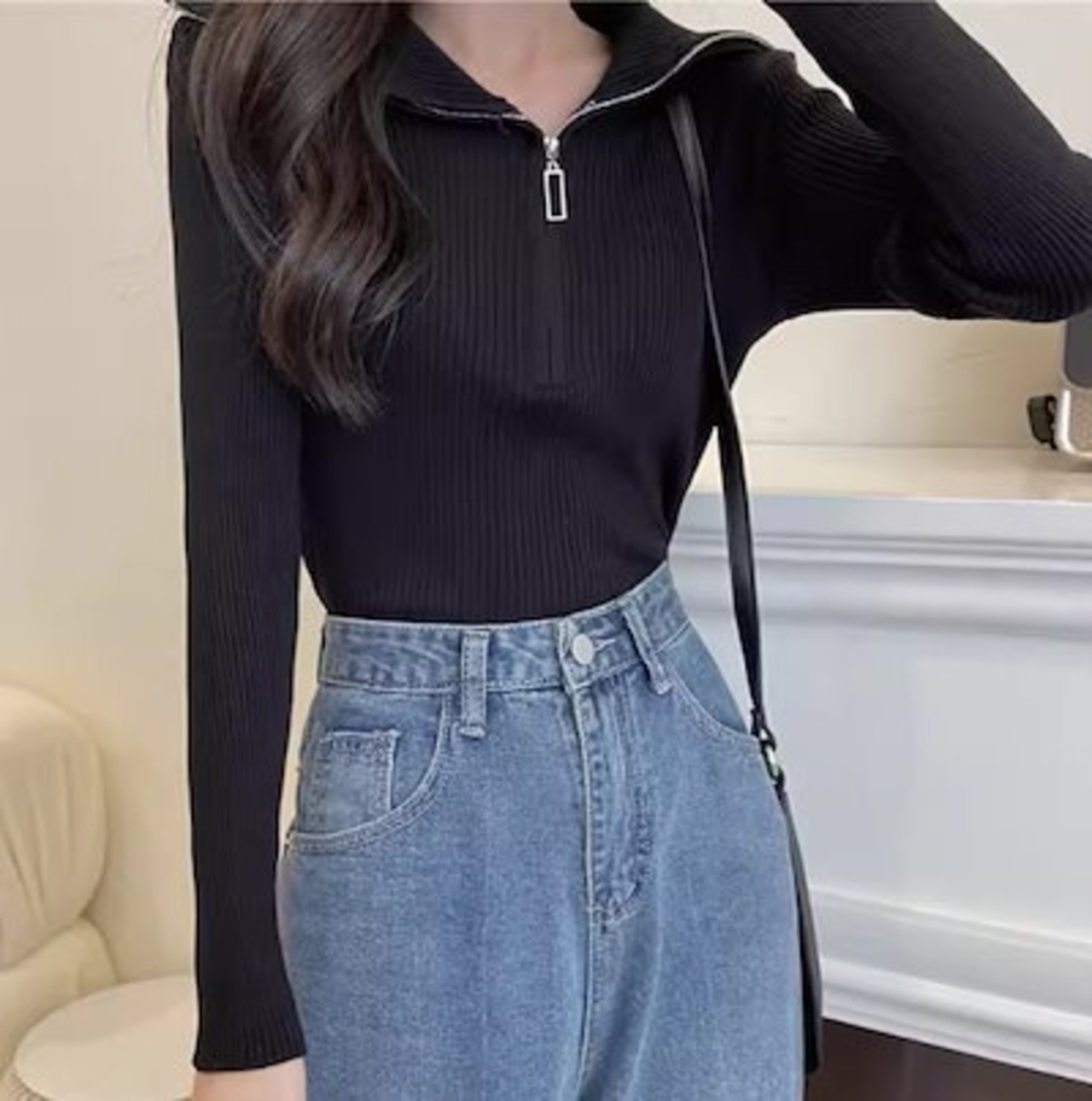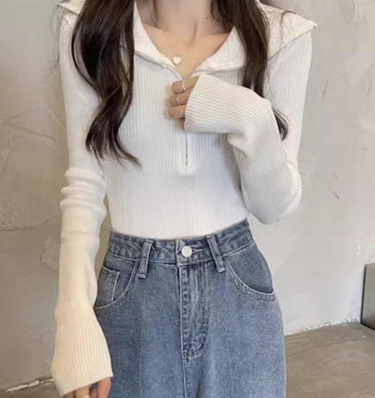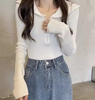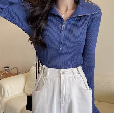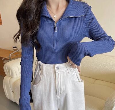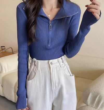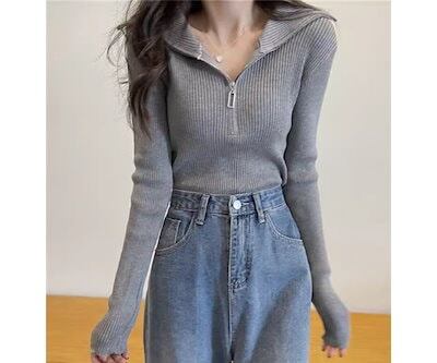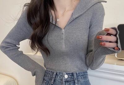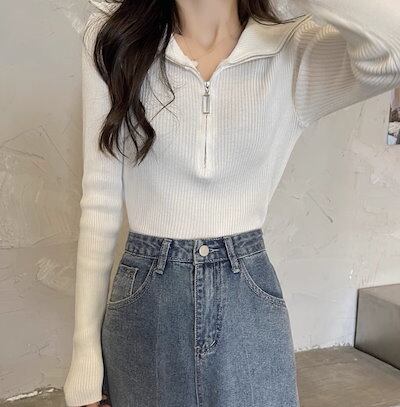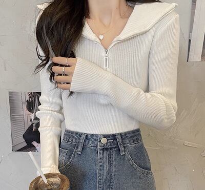 レディース トップス カットソー ニット セーター プルオーバー ショート クロップド丈 長袖 タイト スリム 細身 ファスナー ストレッチ 伸縮性 かわいい 大人可愛い きれいめ シンプル
