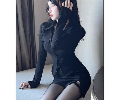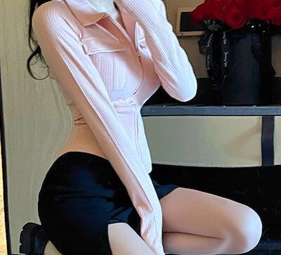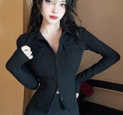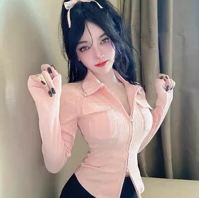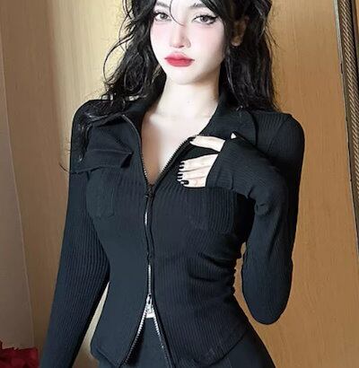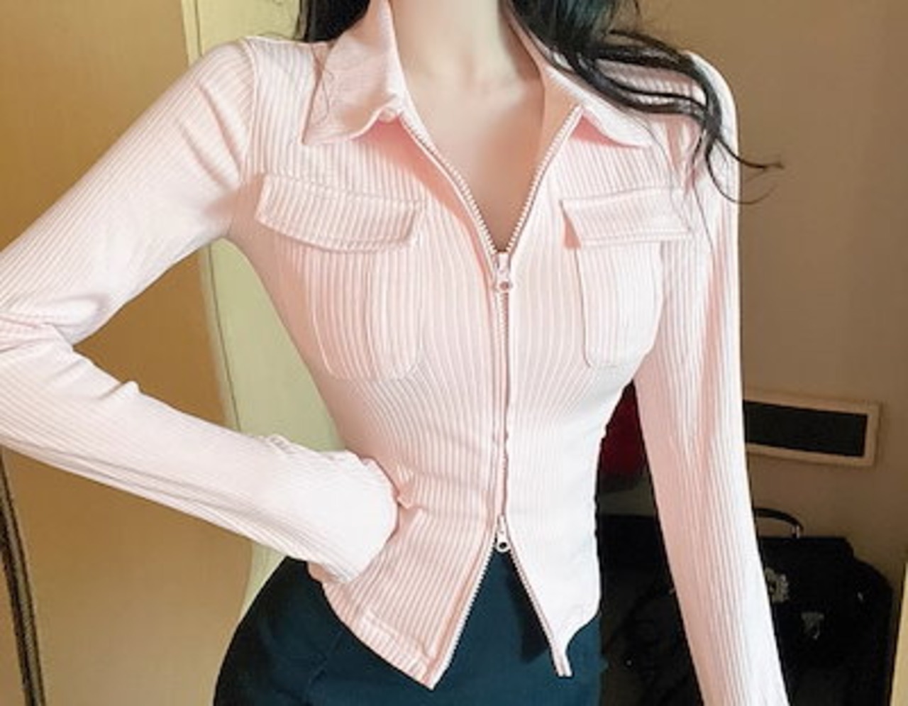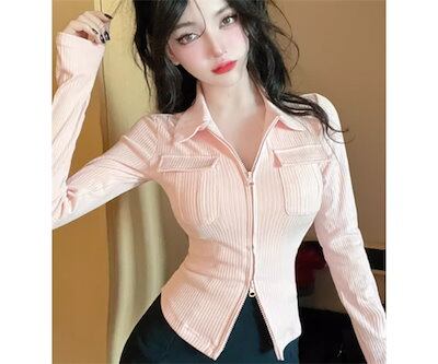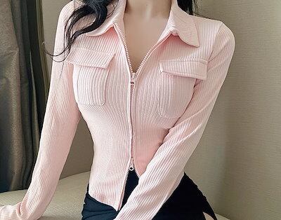 レディース トップス カットソー ニット セーター ショート クロップド丈 長袖 Vネック 襟付き ポロカラー タイト スリム 細身 ファスナー かわいい 大人可愛い シンプル カジュアル おしゃれ