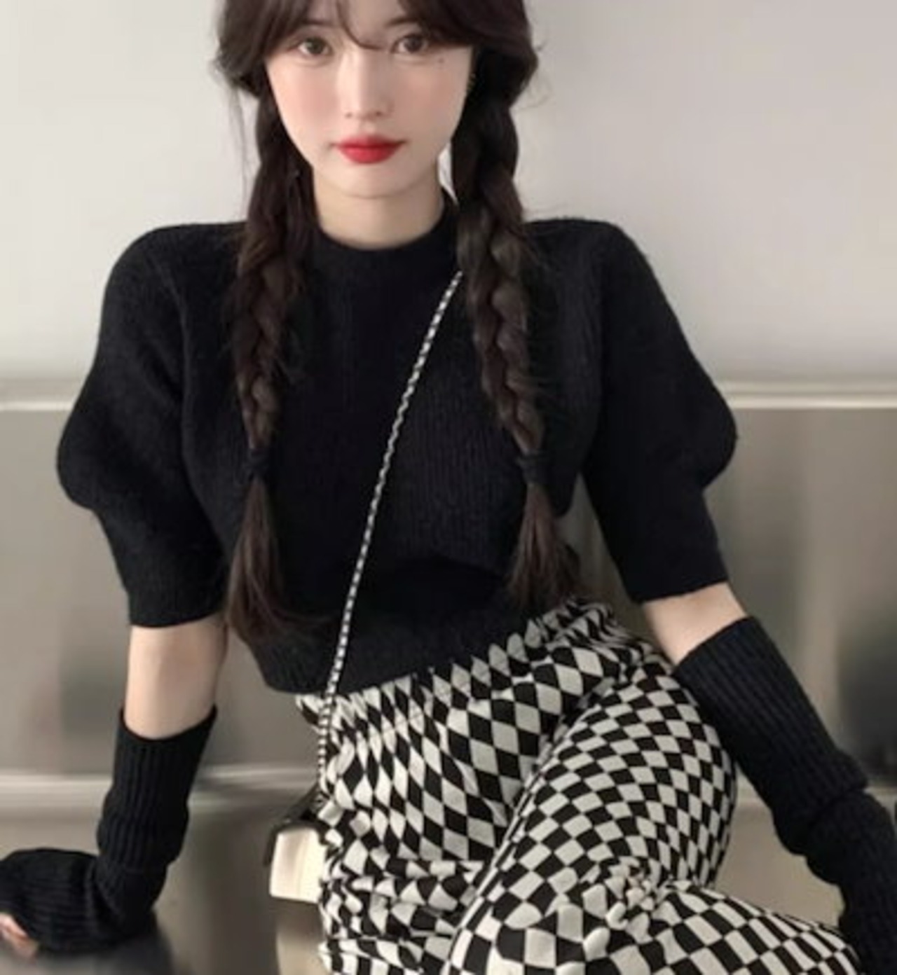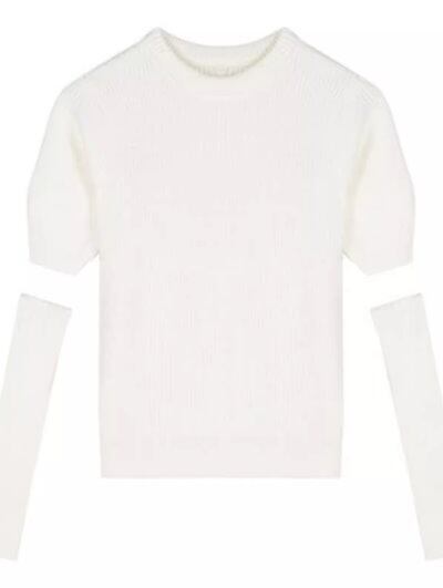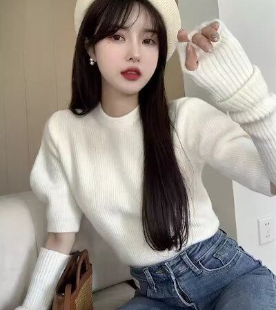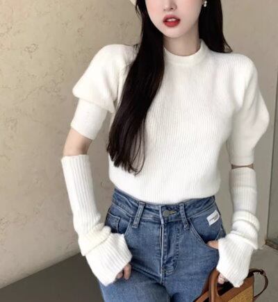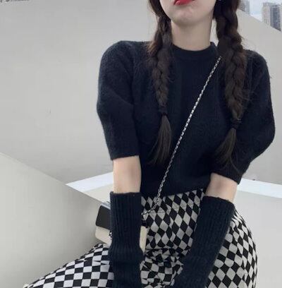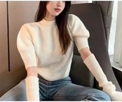 レディース トップス ニット セーター プルオーバー ショート ミドル丈 半袖 長袖 パフスリーブ ラウンドネック スリム 細身 ストレート フェミニン 2way かわいい 大人可愛い シンプル