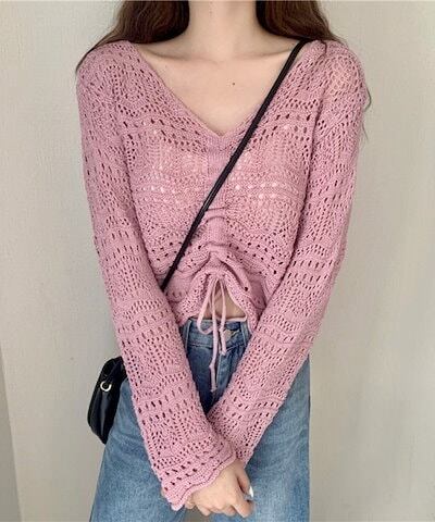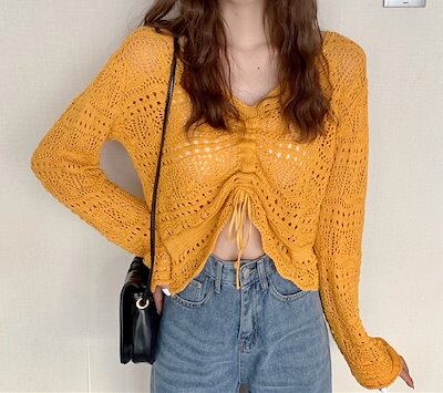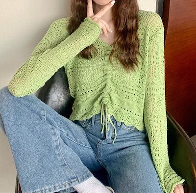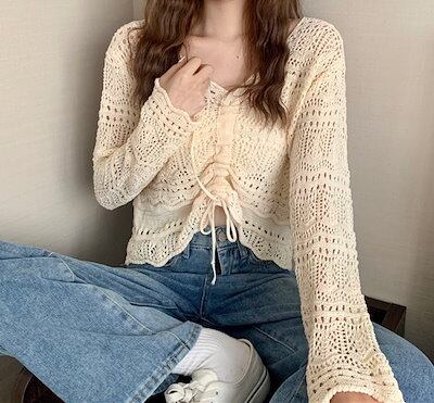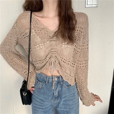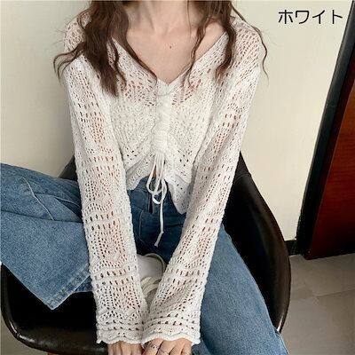 レディース トップス ニット カーディガン プルオーバー クロップド丈 長袖 Vネック 襟なし スリム リボン ドロスト レースアップ 透け感 かぎ針編み 肌見せ 通気性 透かし編み 薄手 かわいい